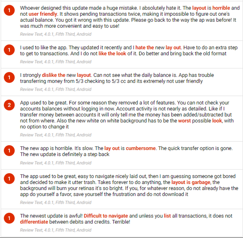Looking at comparative pain-point data on other apps relating to the user interface, Fifth Third used to be mid-pack, with 1.3% of negative feedback relating to this. Since the major release, this has shot up to 10%. This is five times more than the next worst and 15 x more than the segment leader Santander US.