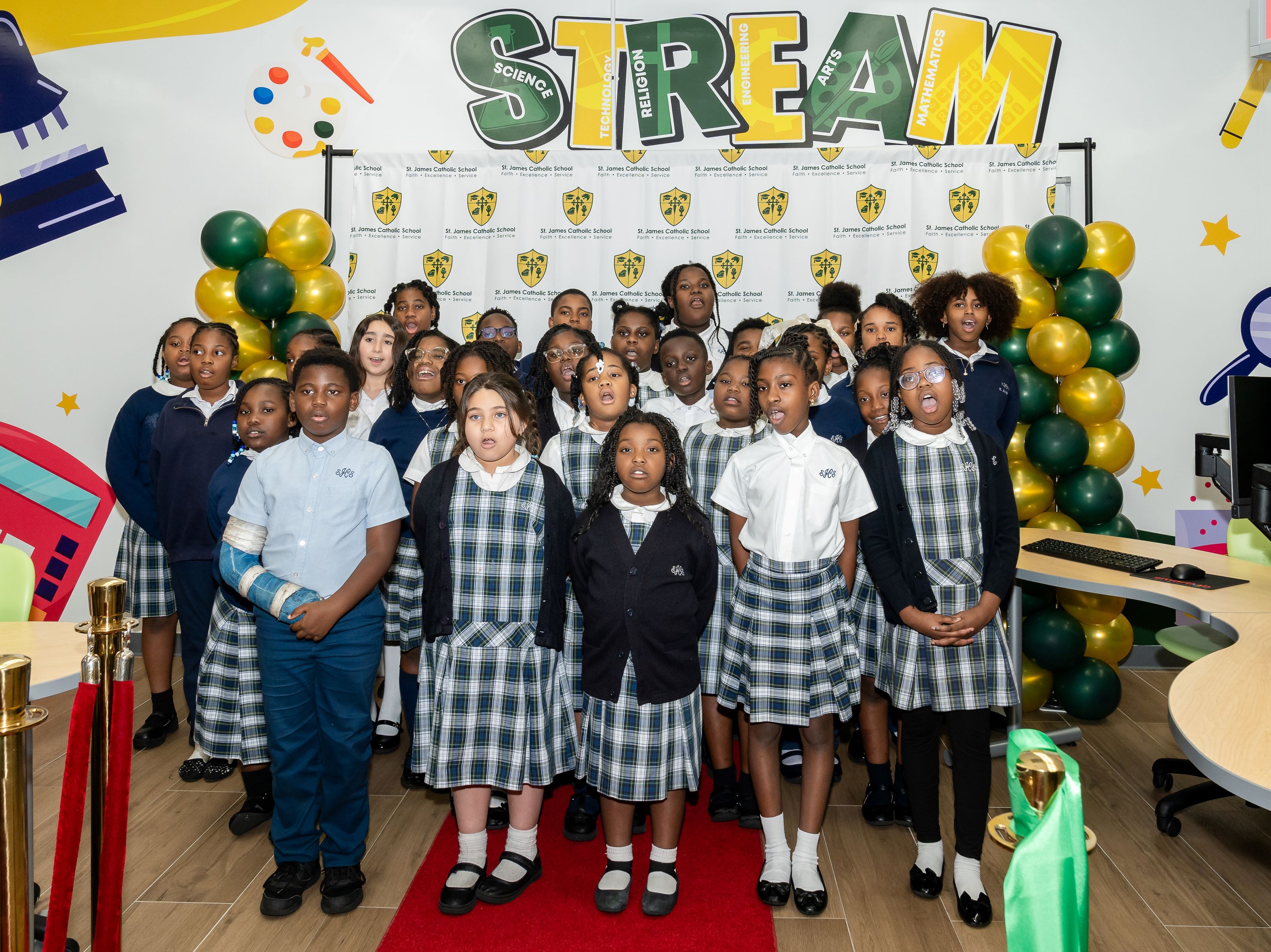 St. James Catholic School students proudly perform at the grand opening of the new STREAM SmartLab, celebrating a future of innovation, creativity, and hands-on learning in Science, Technology, Religion, Engineering, Arts, and Mathematics.