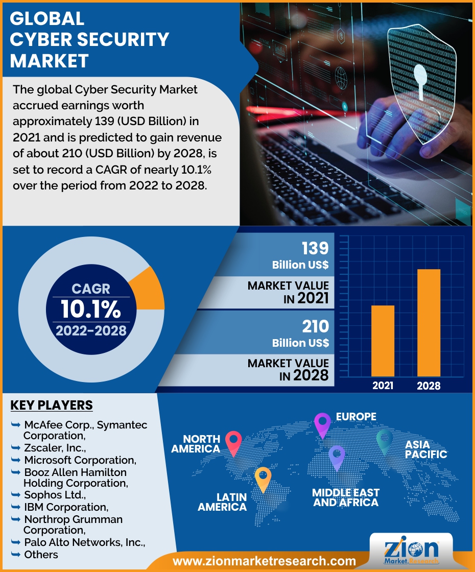 SUITE N202, NEW YORK, UNITED STATES, December 8, 2022 /EINPresswire.com/ — According to study of Zion Market Research, Cyber security industry accrued ROI of approximately around US$ 139 billion in 2021 and is set to gain income of almost US$ 210 billion in 2028. In addition to this, Cyber security Market is estimated to register highest gains of nearly 10.1% in time period of 2022 to 2028. Moreover, Cyber security market is anticipated to gain traction over forthcoming years subject to rise in cyber-attacks with a view of damaging or stealing key information along with stalling business processes. With rise in cybercrimes, cyber terrorism, hacking, and online frauds, deployment of cyber security tools has become need of an hour for every small & big firm. Increase in infiltration of network infrastructure targets and surge in malware attacks as well as cyber wars have resulted in humungous demand for strong cyber security. This has driven expansion of Cyber security market. Strict data protection law enforcement by various firms and evolution of disruptive online systems prone to cyber-attacks has prompted need for cyber security, thereby boosting market growth.