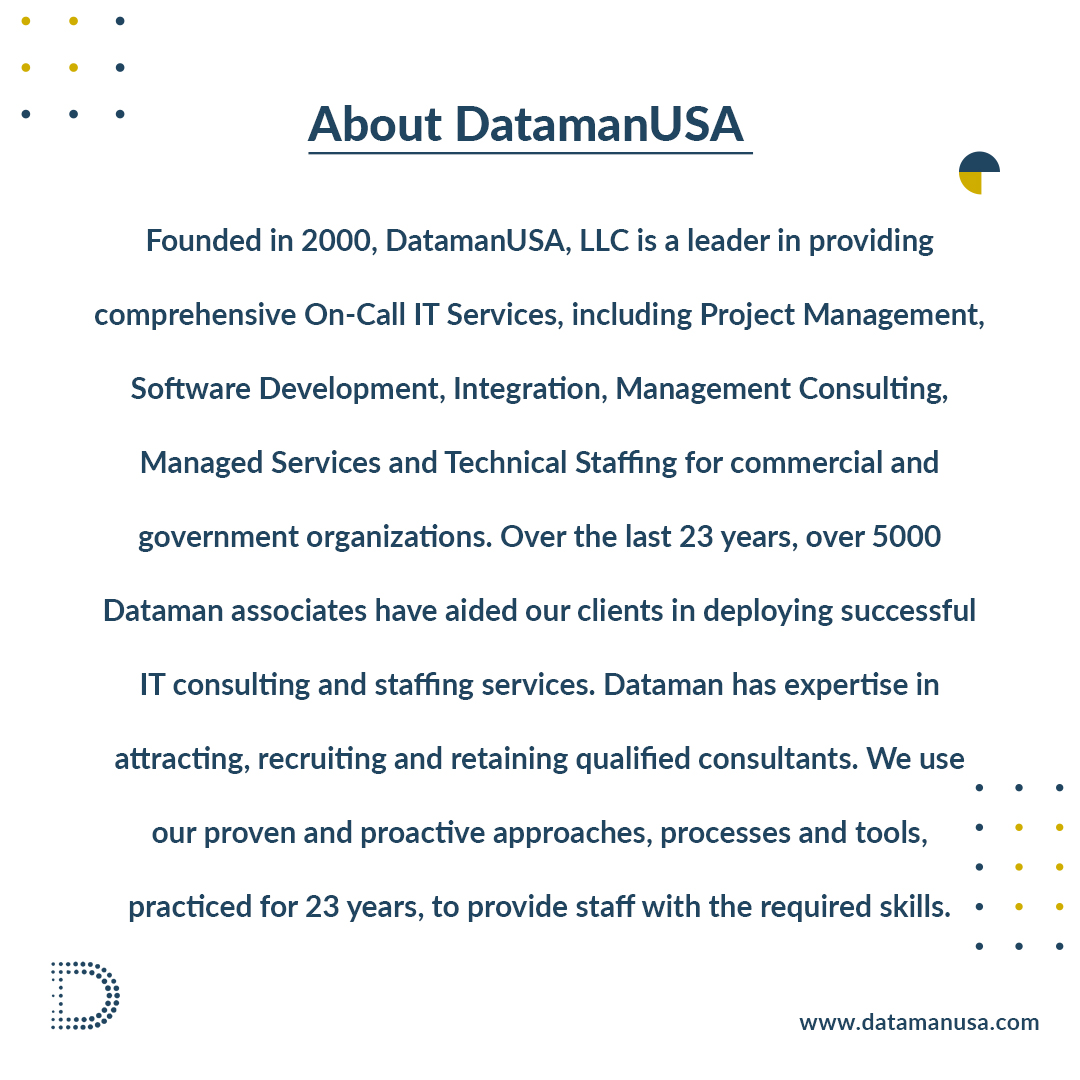 Founded in 2000, Dataman is a leader in providing comprehensive IT Staff Augmentation Services and have extensive experience with Application development, IT Project Management, Planning and Analysis, Database Management and Business Intelligence, End User Support, Systems Administration, Network Services, IT Security, IT Training Services, IT Business and Process Consulting Services, Marketing Services and Data Conversion services. We have a proven history of successfully delivering similar IT Professional Services for public sector and transportation agencies across the country.