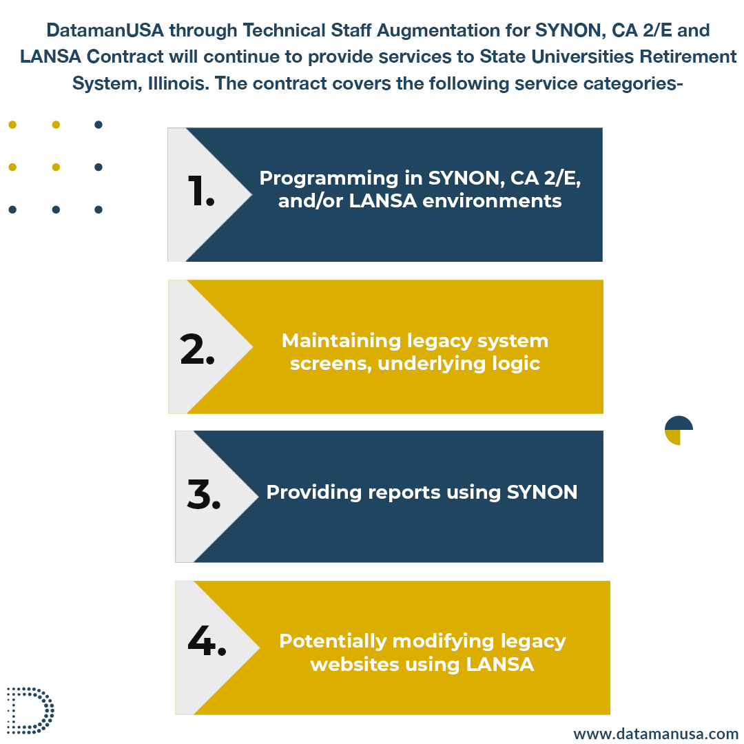 CHICAGO, ILLINOIS, UNITED STATES, March 1, 2024 /EINPresswire.com/ — DatamanUSA through Technical Staff Augmentation for SYNON, CA 2/E and LANSA Contract will continue to provide services to State Universities Retirement System, Illinois. The contract covers the following service categories-