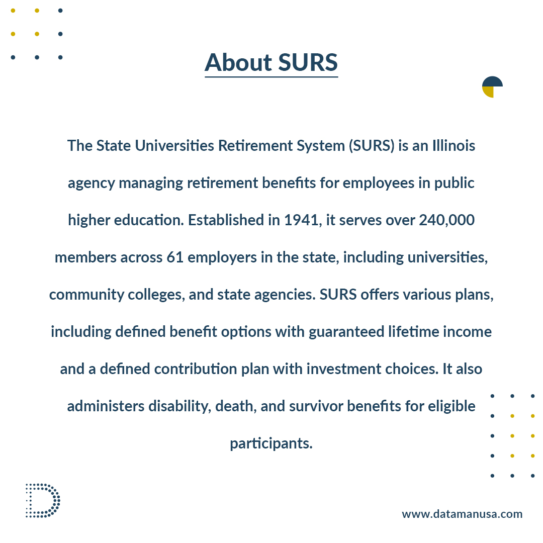 The State Universities Retirement System (SURS) is an Illinois agency that manages retirement benefits for over 240,000 members across 61 public higher education employers in the state.