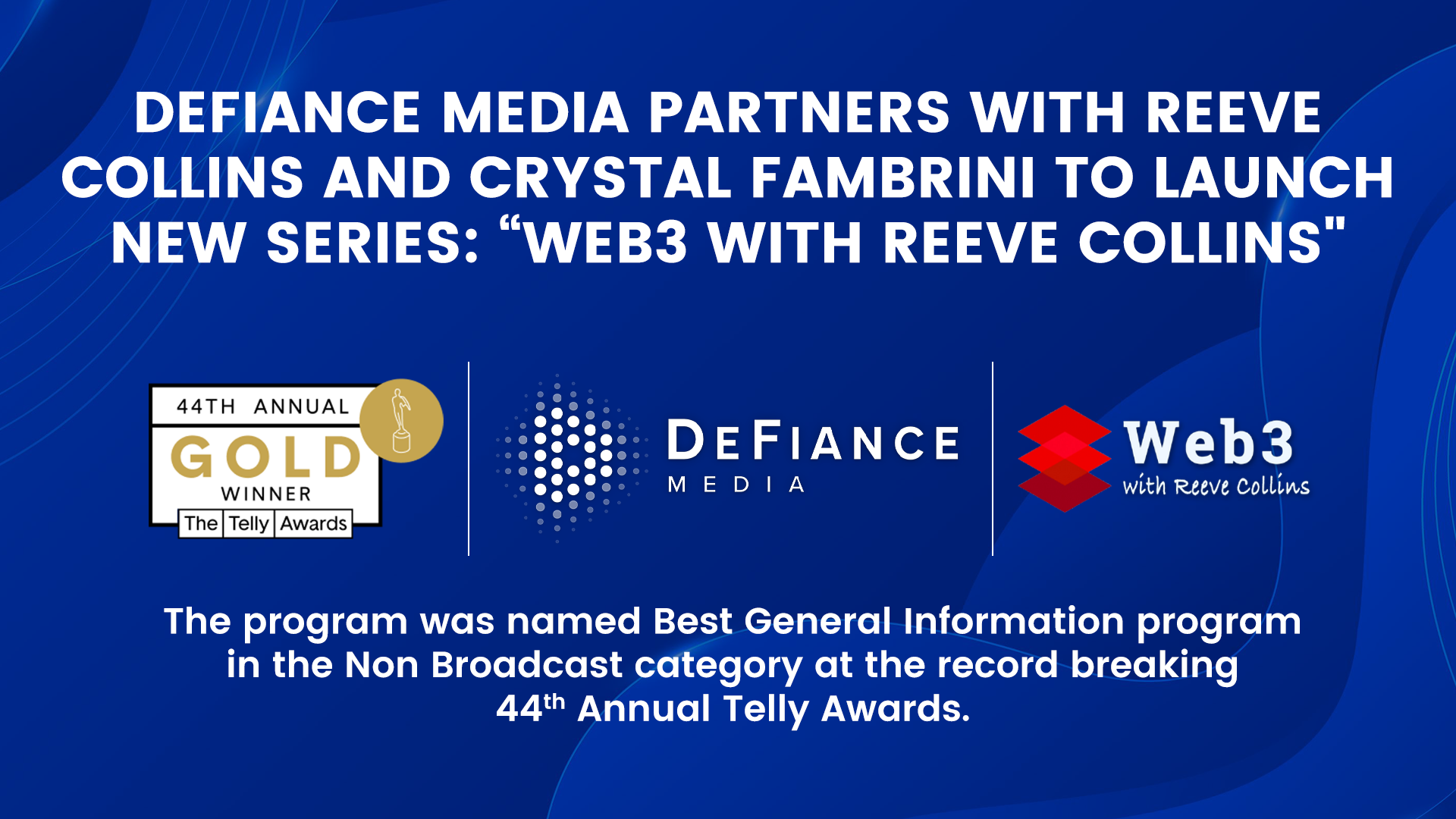 LOS ANGELES, CA, USA, May 31, 2023/EINPresswire.com/ — DeFiance TV, the leading 24-hour global broadcast and FAST network dedicated to alternative finance, innovation and the DeFi lifestyle, announced today that on the heels of the successful release of “Web3 with Reeve Collins”, that it will expand its partnership with executive producers Reeve Collins and Crystal Fambrini for multiple, additional one-hour specials from the pair. The program was named Best General Information program in the Non Broadcast category at the record breaking 44th Annual Telly Awards.