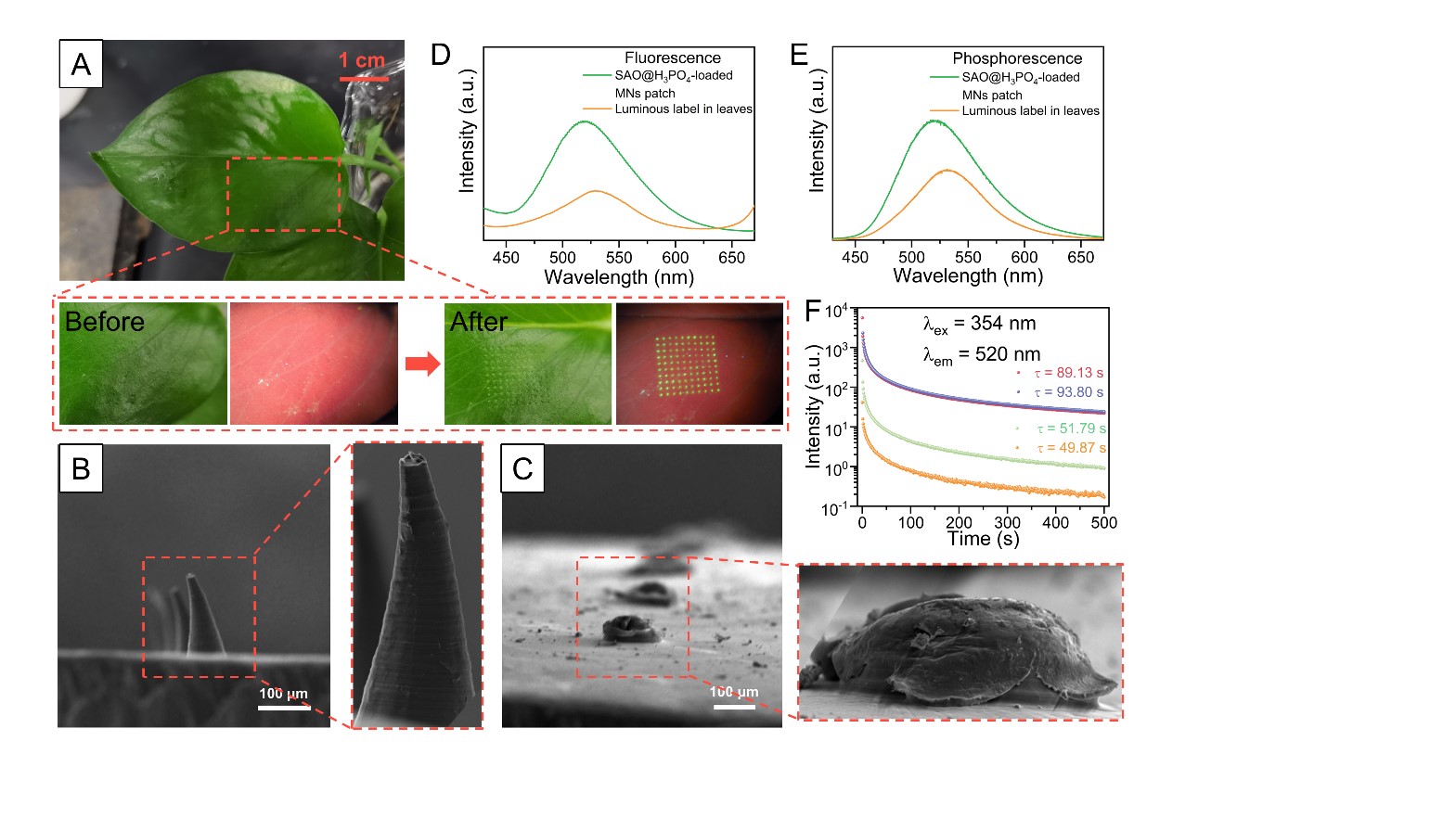 SrAl2O4:Eu2+,Dy3+ with H3PO4 encapsulation (SAO@H3PO4 ) was used as a long afterglow material, this material exhibits good water resistance and enhanced luminescence, uniquely engineered to be spatially embedded within plants through injection by MN patches. These scientists summarize the dual functionality of SAO@H3PO4 based MN patch: