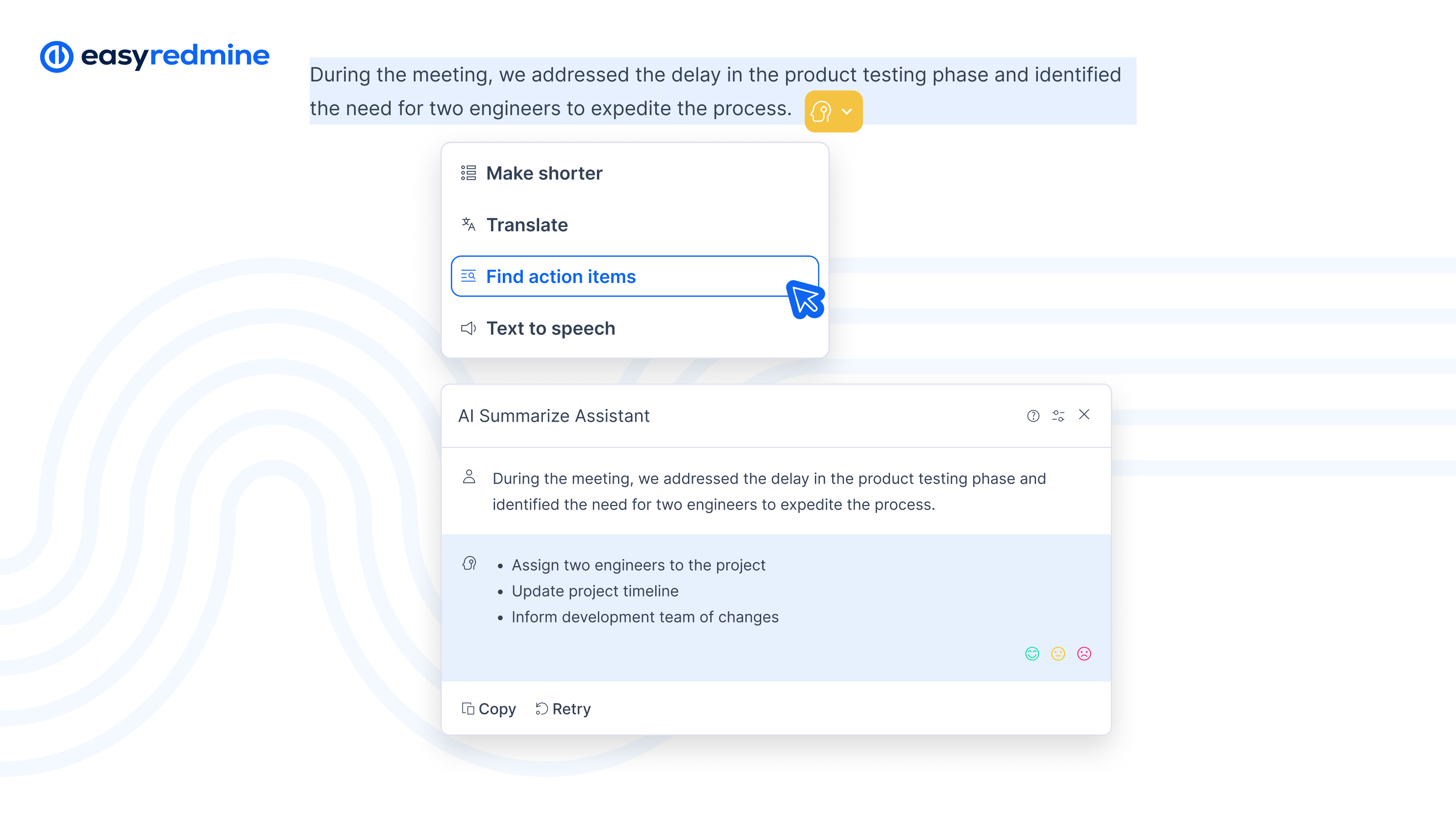 En développant cette nouvelle fonctionnalité, l’outil de gestion de projet Easy Redmine fait passer la sécurité des données de ses clients au premier plan, prenant en compte les découvertes présentées dans le rapport de Deloitte (Summer 2023 Fortune/Deloitte CEO Survey). D’après ce rapport, 92 % des PDG utilisent ou testent déjà une forme d’IA générative, et leurs plus grandes inquiétudes sont liées à la sécurité et à la conformité. Avec Easy AI, soyez assurés qu’aucune autre personne n’a l’autorisation d’accéder et de travailler avec les informations confidentielles de votre entreprise. Faites en sorte que vos processus de gestion de projet restent confidentiels et sécurisés.
