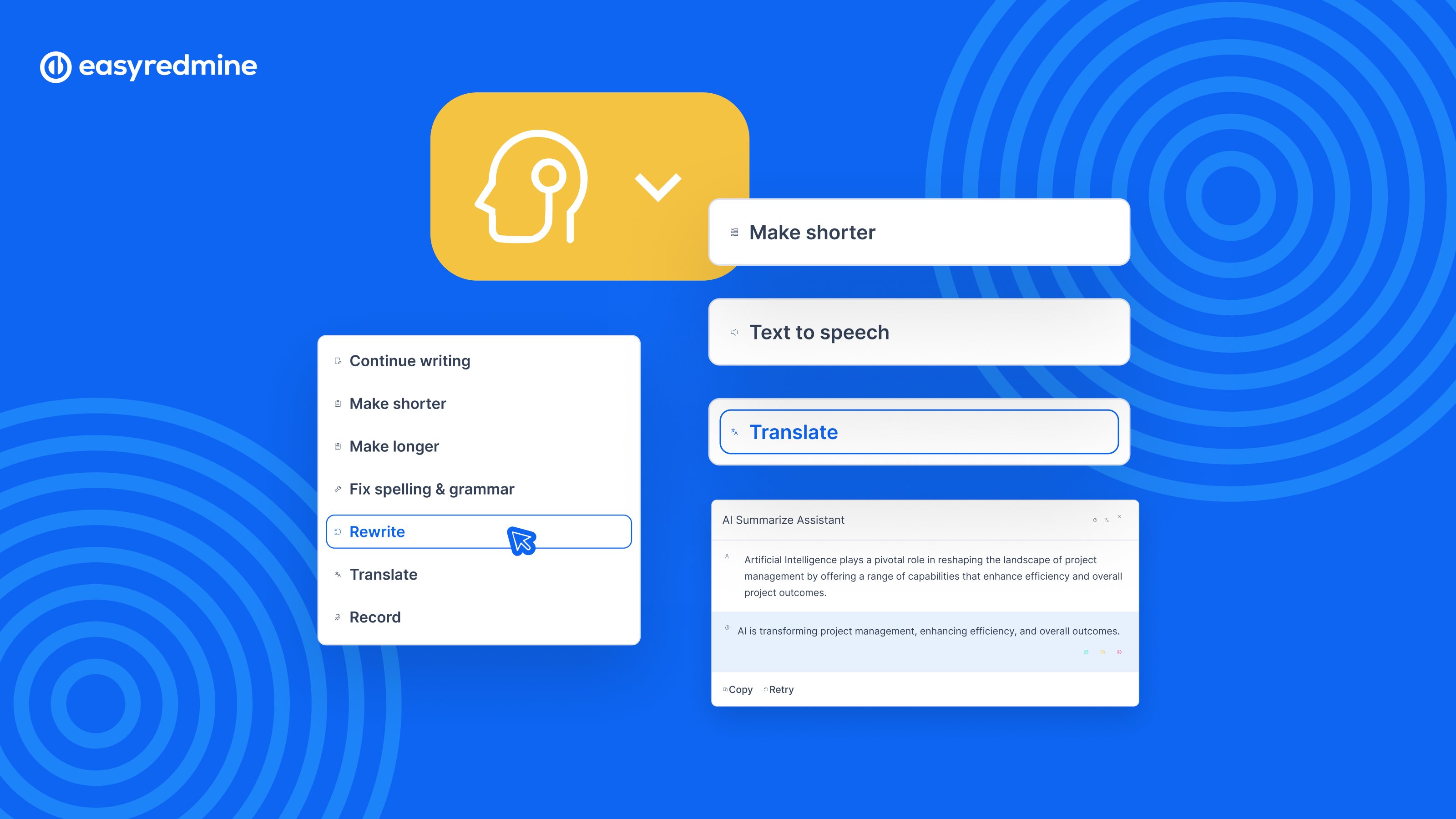 Easy Redmine croit en la liberté de choix de ses clients. Easy AI peut être alimenté par OpenAI ou une IA open-source entièrement privée, ce qui vous permet de passer de l’une à l’autre le cas échéant. Cette flexibilité vous garantit de garder le contrôle sur la technologie IA qui pilote vos processus de gestion de projet tout en conservant vos données en sécurité.