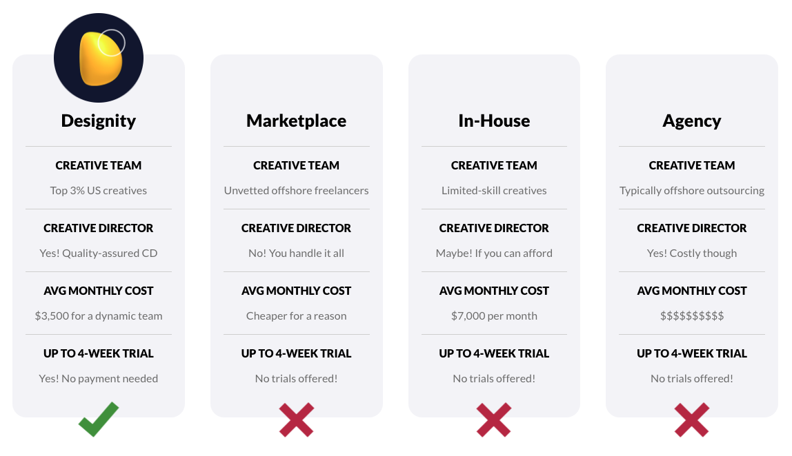 When clients begin working with Designity, they connect with dedicated Creative Directors (CD) as the primary point of contact. The CD collaborates with an interchangeable team of creatives to support brands with any design and marketing needs. The CD’s responsibilities include discussing the client’s objectives to create a project brief and timeline, assigning the right creatives from the vetted pool, and managing them to ensure a hassle-free and high-quality outcome. This model results in a 10x faster turnaround than traditional creative agencies and 65% lower cost than in-house creative teams.