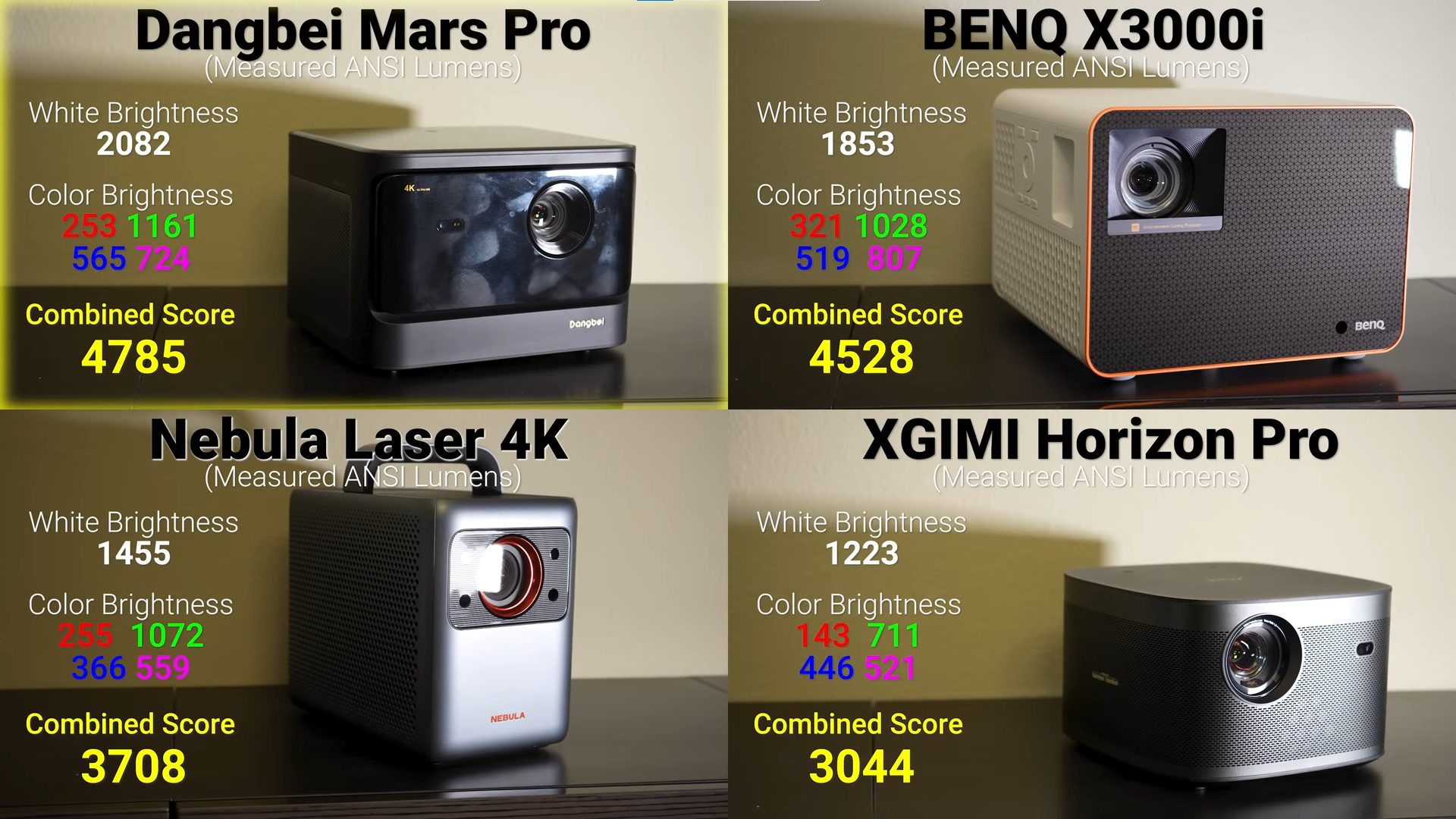 The contrast is also super important in the projector world and the standard for measuring it is called full on full off or FOFO. Using this method the BenQ X3000i had the best contrast of around 900: 1 followed by the Dangbei Mars Pro at 710: 1, then the Nebula laser at 655: 1, and last was the XGIMI Horizon Pro at 488: 1. You might notice how far off these numbers are from the claimed values on their product pages. But due to the test conditions being different, the results may indicate differently. But all these statistics are measured in real-world conditions. You may have these as references.