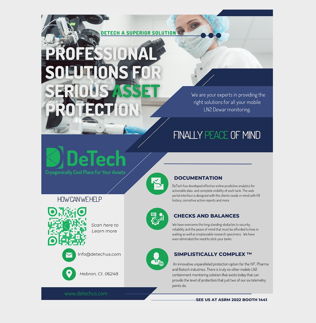 About DeTech: DeTech is a Connecticut based cryogenic technology company that was founded by Mark and Ric Langley after two catastrophic storage containment failures occurred within the IVF industry in 2018. Having extensive experience in this field, the founders set out to identify the deficiencies that caused these failures and create a better asset protection system. Because of our unique patented solution and the projected growth of the LN2 industry as quoted in Market-Watch DeTech seeks strategic alliances with industry leaders in asset protection in order to keep pace with the projected demand for our superior approach.