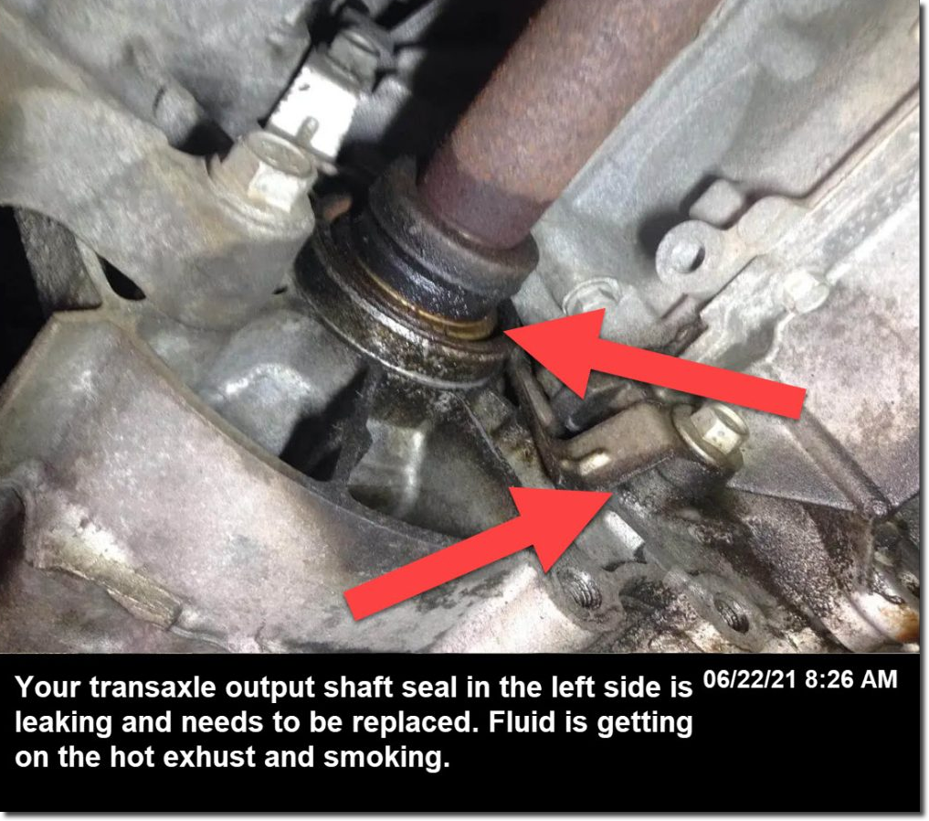 The inspection includes research to address the customer’s reason for making the appointment, documenting the state of vehicle health using images, notes, videos, and recommended actions in a language the layperson can quickly understand and use as reference. Then, just like a doctor’s visit starts always with taking the vital signs, a Digital Inspection result covers all important conditions of the vehicle; typically a 50-point inspection. Each condition gets notes. Plus, to receive a Digital Auto Checkup certification, the inspection results must include topics with mandatory documentation using images and videos. The images will be edited to show the condition, cause, and corrective action(s) to the layperson. For instance, embedded in this article is a typical example of the symptom “my car smells like burning oil”.