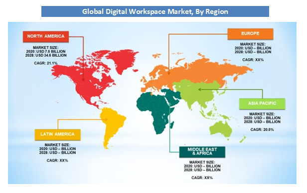 The global digital workplace market accounted for USD 24070.3 Million in 2020 and is expected to reach USD 109545.6 Million by 2028, growing at a CAGR of 20.9% from 2021 to 2028. ”