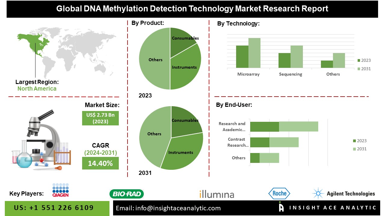 JERSEY, NJ, US, April 2, 2024 /EINPresswire.com/ — InsightAce Analytic Pvt. Ltd. announces the release of a market assessment report on the “Global DNA Methylation Detection Technology Market– (By Product (Consumables, Instruments and Software), By Technology (Polymerase Chain Reaction (PCR), Microarray, Sequencing and Other Technologies), By Application (Translational Research and Diagnostic Procedure), By End-user (Contract Research Organization (CRO), Research and Academic Laboratories, Biopharmaceutical and Biotech Companies, And Other End User)) Trends, Industry Competition Analysis, Revenue and Forecast To 2031.”