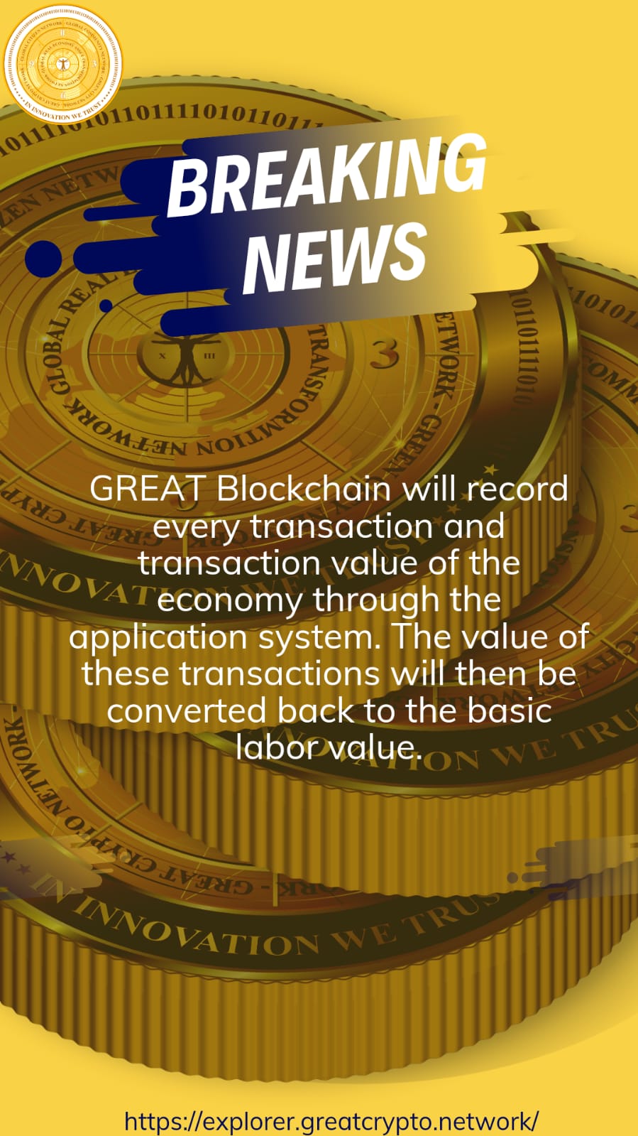 Melihat kembali sejarah perkembangan blockchain, sebelum lahirnya Bitcoin, tidak ada yang bisa membayangkan mentransfer uang dari satu rekening ke rekening lain dengan aman tanpa ada lembaga keuangan di antaranya, seperti bank. Teknologi Blockchain menghadirkan cara baru yang radikal dan inovatif untuk melakukan segala bentuk transaksi melalui Internet. Munculnya Bitcoin dan blockchain telah membawa banyak perubahan pada dunia keuangan, bahkan perekonomian dunia yang sebelumnya dioperasikan menggunakan mata uang Fiat. Dengan temuannya, kedua PhD siap menciptakan transformasi digital transaksi dan nilai transaksi ekonomi dunia yang transparan dan publik melalui pengakuan nilai menggunakan aset digital GREAT. Popularitas Smartphone dan Internet membuat pencatatan nilai transaksi GREAT Blockchain semakin melimpah, populer, mudah, transparan dan bernilai. GREAT Blockchain berjanji untuk benar-benar menjadi aset digital yang sangat berharga di masa depan ketika diluncurkan secara resmi pada 10/10/2023.