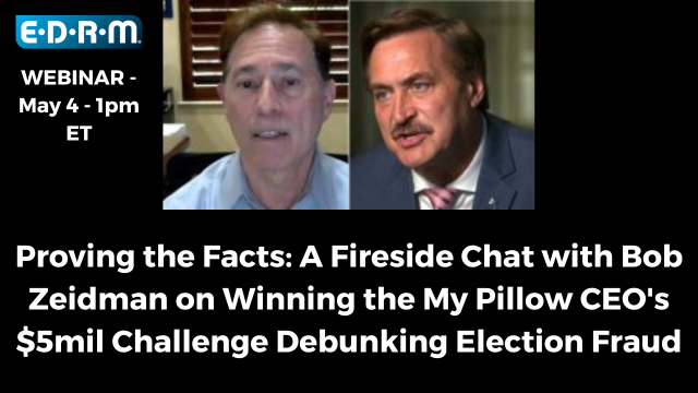 MINNEAPOLIS, MN, USA, April 26, 2023/EINPresswire.com/ — Setting the global standards for e-discovery, the Electronic Discovery Reference Model (EDRM) is pleased to announce a new flash webinar in their series “Ripped from the Headlines” called “Proving the Facts: A Fireside Chat with Bob Zeidman on Winning the My Pillow CEO’s Challenge.”