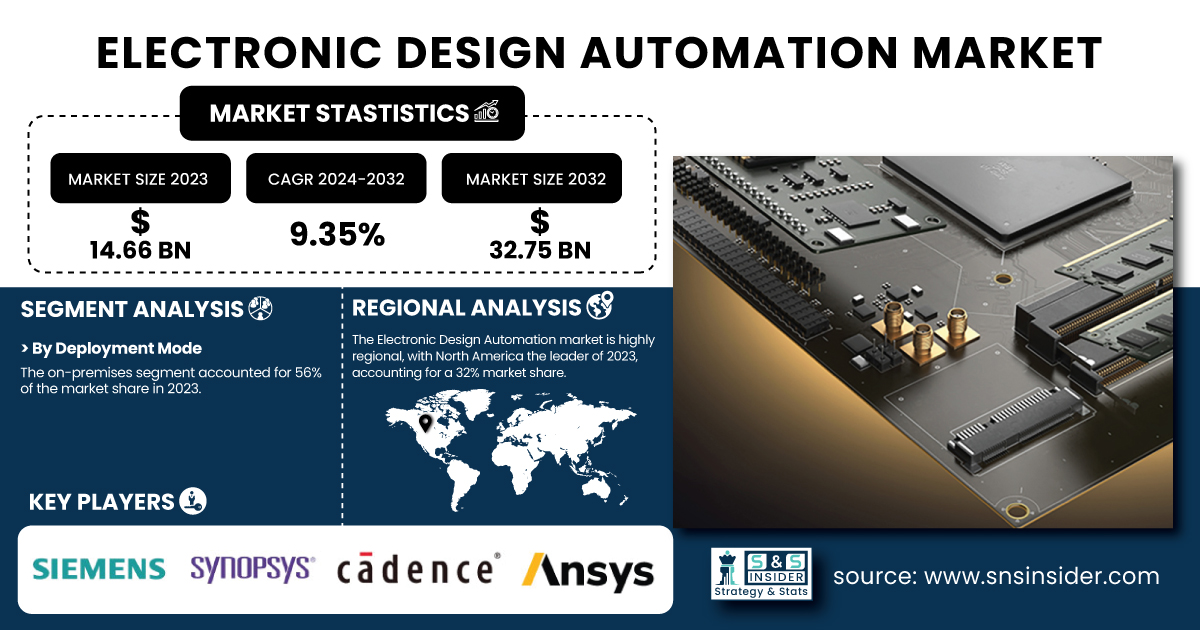 As Per the SNS Insider,“The Electronic Design Automation (EDA) Market was valued at USD 14.66 billion in 2023 and is expected to grow to USD 32.75 billion by 2032, at a CAGR of 9.35% over the forecast period of 2024-2032.”