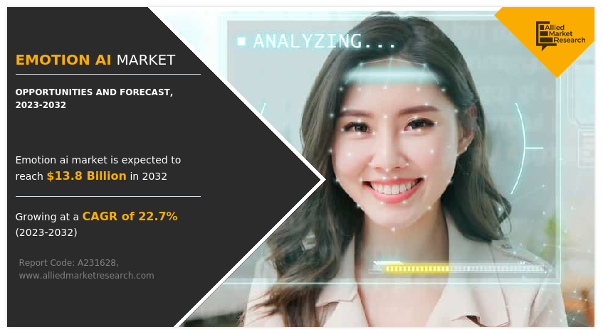 WILMINGTON, NEW CASTLE, DE, UNITED STATES, March 17, 2025 /EINPresswire.com/ — The global 𝐄𝐦𝐨𝐭𝐢𝐨𝐧 𝐀𝐈 𝐌𝐚𝐫𝐤𝐞𝐭 was valued at $1.8 billion in 2022, and is projected to reach $13.8 billion by 2032, growing at a CAGR of 22.7% from 2023 to 2032. Substantial growth in AI and ML technologies, the increase in adoption of biometrics and facial recognition and surge in the usage of emotion detection solutions in several industries are the major factors that drive the growth of the global Emotion AI market. However, the high cost of application and development, and data storage and management hamper market growth. Furthermore, integration in IoT-based technologies and expansion of wearable devices in various applications creates ample opportunities for the emotion AI market.