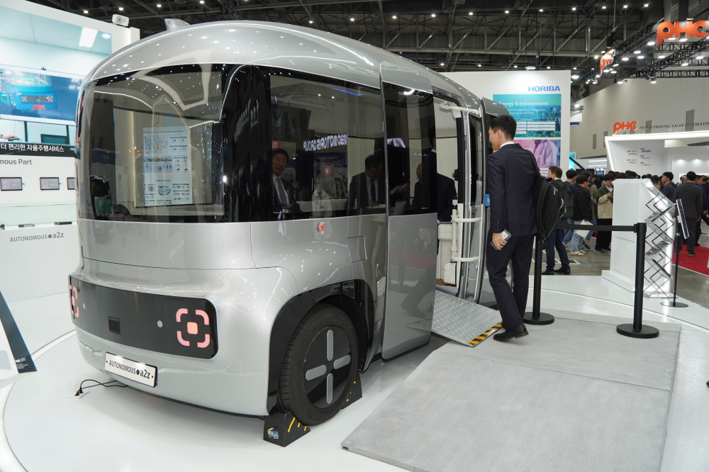 Hong Joon-Pyo, Mayor of Daegu, Baek Won-kook, Second Vice Minister of the Ministry of Land, Infrastructure, and Transport, and other invitees trying the autonomous mobility platform ‘Project MS’ at the Autonomous a2z booth | Photo courtesy – AVING News