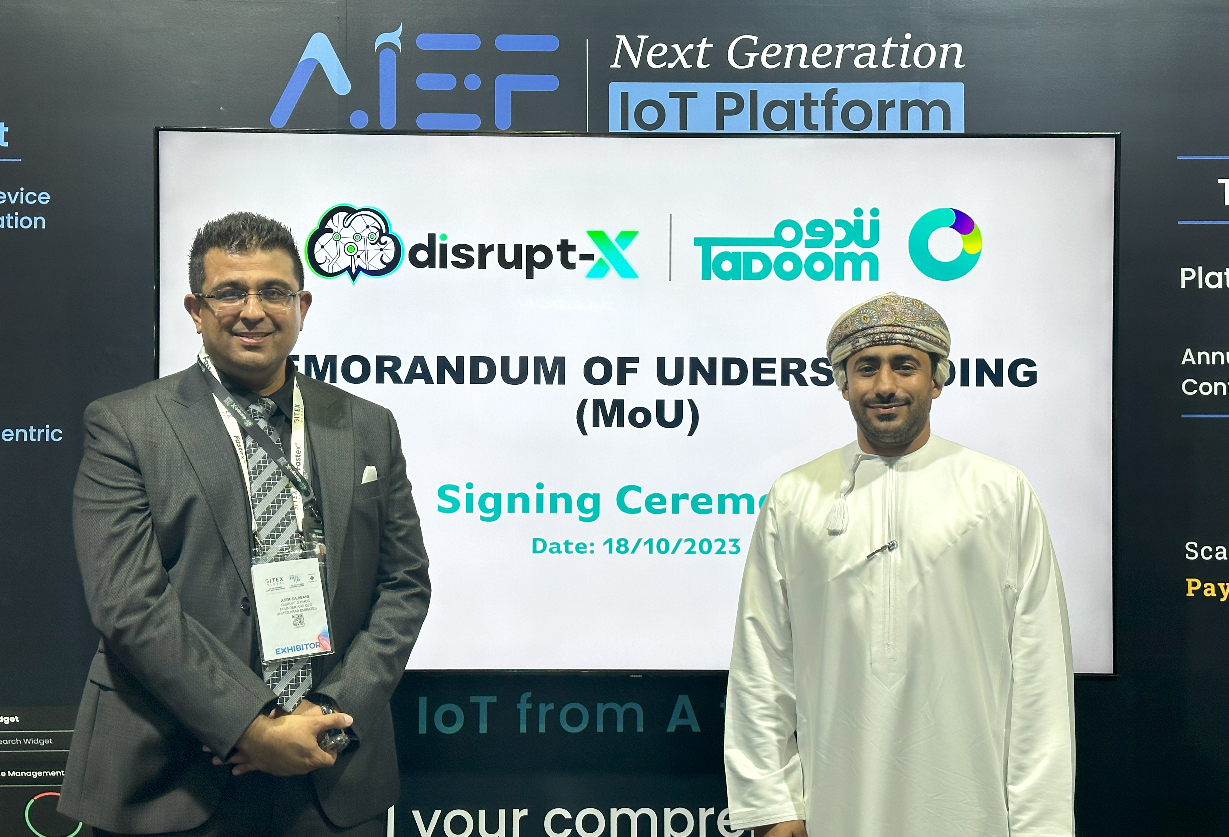 DUBAI, UNITED ARAB EMIRATES, October 24, 2023 /EINPresswire.com/ — Disrupt-X, a leading developer and provider of Internet of Things (IoT) solutions platform, and Tadoom, Oman’s leading semi-governmental authority on smart city applications, have unveiled a strategic collaboration. Together, they aim to expand the reach and adoption of Internet of Things (IoT) technologies throughout Oman, setting the stage for a seamlessly connected future.
