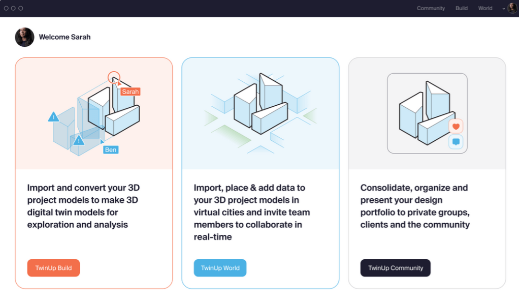 The TwinUp software suite includes three seamlessly integrated apps: TwinUp Community™, TwinUp Building™, and TwinUp World™.