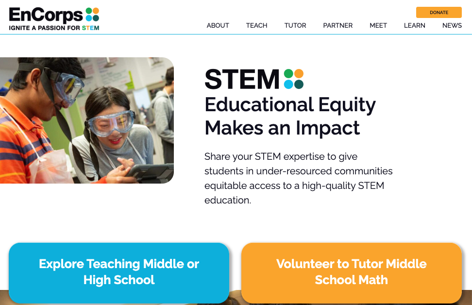 Founded in 2007, EnCorps Inc. is a Los Angeles-based nonprofit with operations in California as well the greater Denver, Colorado and New York City areas. EnCorps connects highly effective STEM educators with public school students to counter the systemic injustice preventing children in under-resourced communities from accessing a high-quality STEM education. The EnCorps STEM Teachers Program® recruits, selects and supports STEM professionals and experts in the science, technology, engineering and math (STEM) fields as well as individuals who possess an advanced STEM degree to transition to teaching as an innovative, long-term solution to the STEM teachers shortage and to counter the alarming lack of math proficiency of middle and high school students nationwide. The EnCorps STEMx Tutors Program matches middle school students, currently under-performing in math, with volunteer STEM professionals, subject-matter experts and STEM college students to increase math skills and confidence prior to students entering high school.