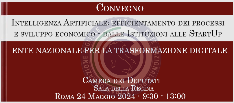 ROME, ITALY, May 17, 2024 /EINPresswire.com/ — On May 24, 2024, the prestigious Sala della Regina at the Chamber of Deputies will host the conference “Artificial Intelligence: Process Optimization and Economic Development – From Institutions to Startups,” organized by the National Agency for Digital Transformation (ENTD).