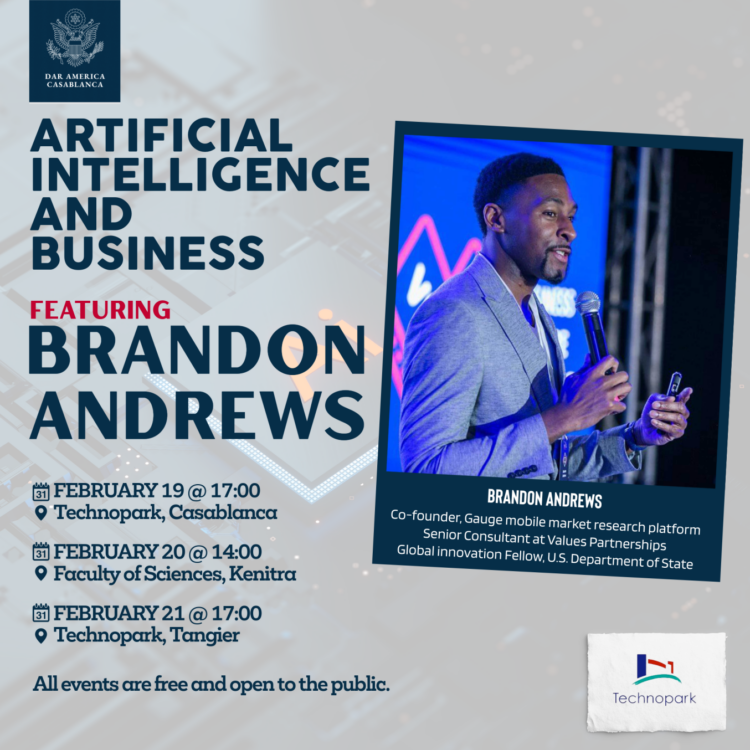 WASHINGTON, DC, USA, February 26, 2024 /EINPresswire.com/ — Brandon Andrews, a tech entrepreneur and entertainment leader, led an artificial intelligence event series in Morocco – hosting seven events in three cities from February 19-23, 2024. Local technologists, entrepreneurs, creatives, students, professionals, and interested community members attended the events hosted in Casablanca, Kenitra, and Tangier.
