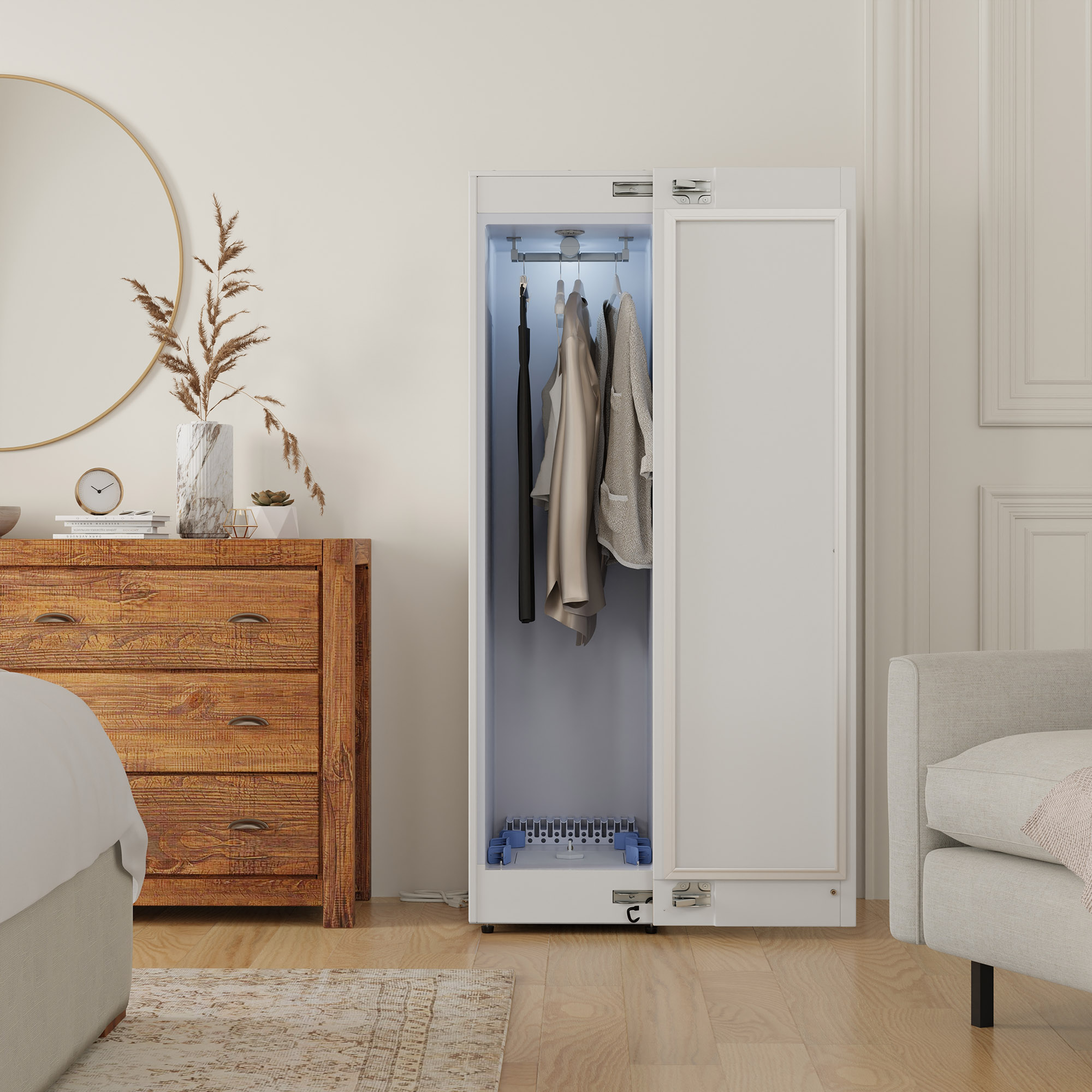 The sleek 59⅓” x 22” x 15¾” design, complete with adjustable legs, makes the Smart Dry Closet a space-saving addition to any bedroom or laundry room. Despite its advanced capabilities, the appliance operates ultra-quietly, allowing it to run at night without disturbing the household. Its auto-cooling function and built-in dehumidifier ensure that clothes come out ready to wear, with no excess steam or moisture.
