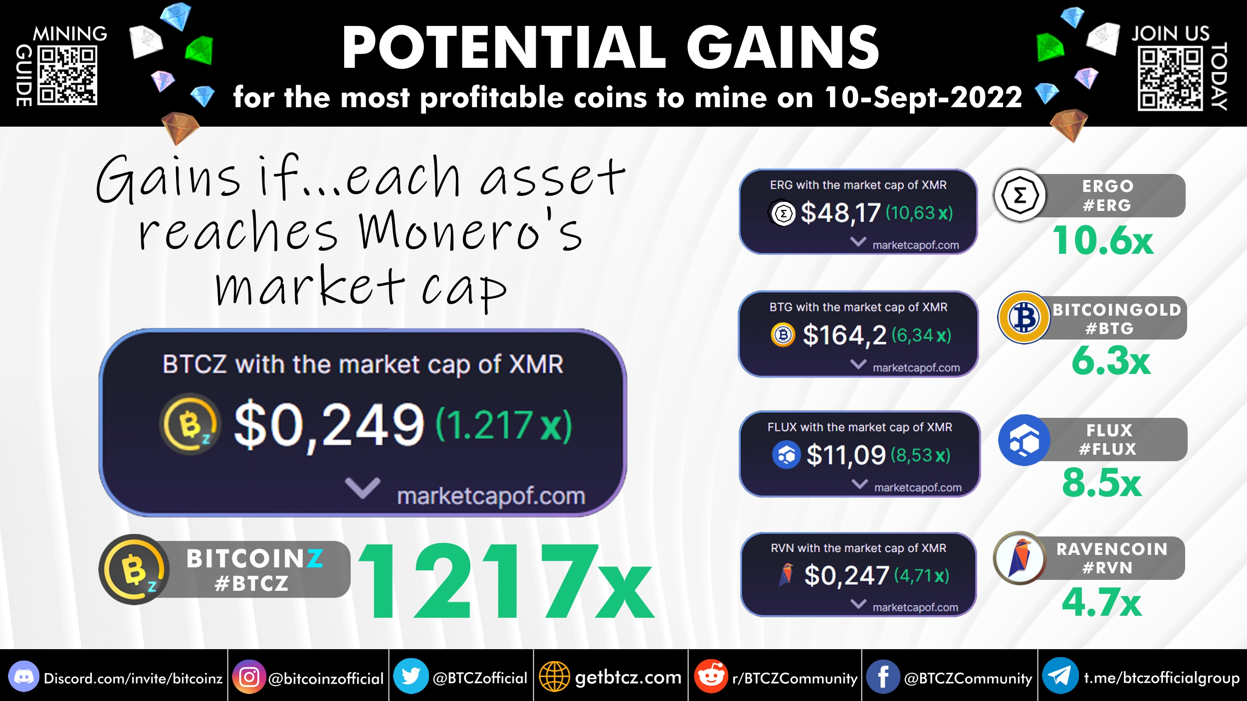 Even in the two other scenarios of 100th and 50th market capitalization positions, an investment to the other four assets (RVN, ERGO, FLUX & BTG) today would lead to very small gains mostly between +50% to 2X or to even losses. Contrastingly BitcoinZ would see a +15500% gain in the 100th position and a +41000% gain in the 50th position. So for every $1 of BitcoinZ investment today, in these scenarios the BTCZ holder would have $150 or $410.