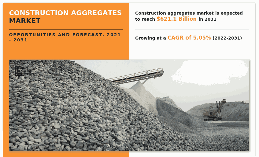 The global construction aggregates market size was valued at $375.3 billion in 2021, and is projected to reach $621.1 billion by 2031, growing at a CAGR of 5.05% from 2022 to 2031