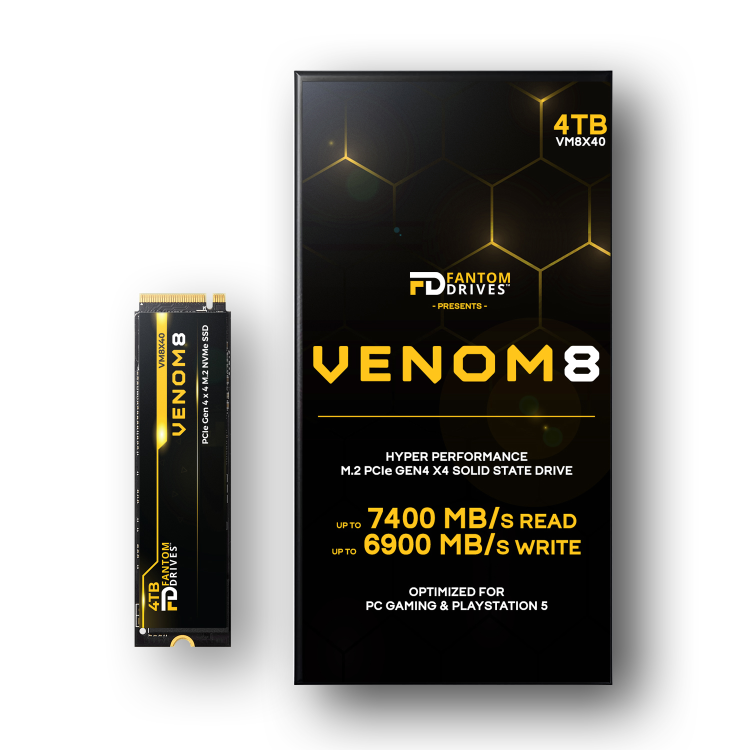 TORRANCE, CALIFORNIA, UNITED STATES, September 27, 2022 /EINPresswire.com/ — Fantom Drives™, a consumer, prosumer and SMB data storage innovator, today announced VENOM8™, the company’s high-performance portfolio of NVMe solid state drives for high throughput gaming, virtual reality, 4K/8K video production, and business applications. The new drive models are available in 1, 2 and 4TB drive capacities and feature easy installation with PCIe, Gen 4, Gen3, Gen2, and Gen1 motherboards.