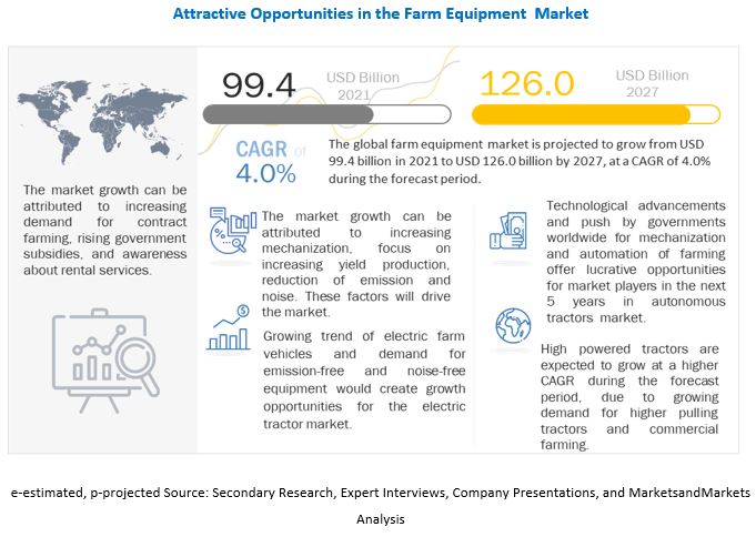 NORTHBROOK, IL, INDIA, June 20, 2022 /EINPresswire.com/ — The global Farm Equipment Market is projected to grow from USD 99.4 Billion in 2021 to USD 126.0 Billion by 2027, at a CAGR of 4.0% during the forecast period. Government support with farm loan waivers/credit finance, OEM/sales incentives to support dealer service and rental operations, increase in farm mechanization, and contract farming are the major factors driving the growth of the Farm Equipment Market.