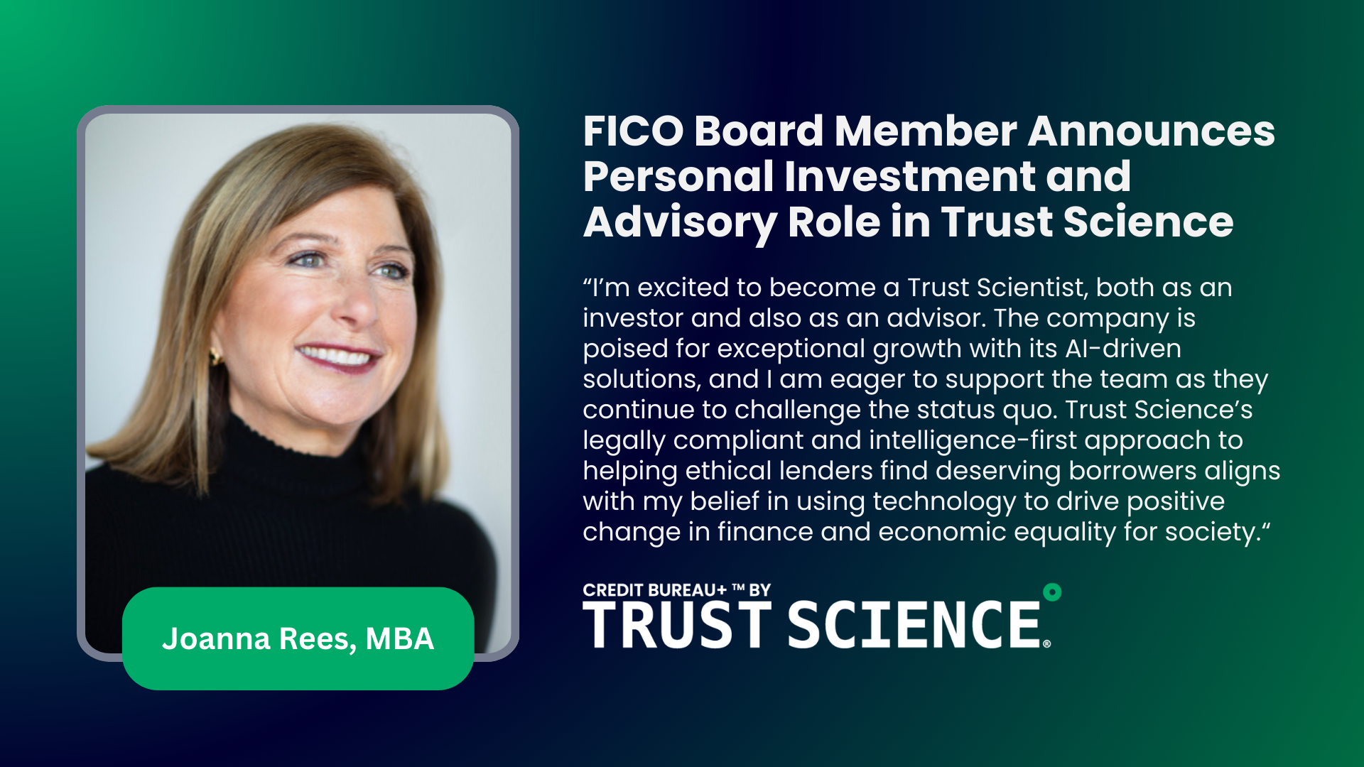 “I’m excited to become a Trust Scientist, both as an investor and also as an advisor,” said Joanna Rees. “The company is poised for exceptional growth with its AI-driven solutions, and I am eager to support the team as they continue to challenge the status quo. Trust Science’s legally compliant and intelligence-first approach to helping ethical lenders find deserving borrowers aligns with my belief in using technology to drive positive change in finance and economic equality for society. I have numerous ideas for how I will help Evan drive the company’s continued success and achieve Evan’s vision for global impact.”