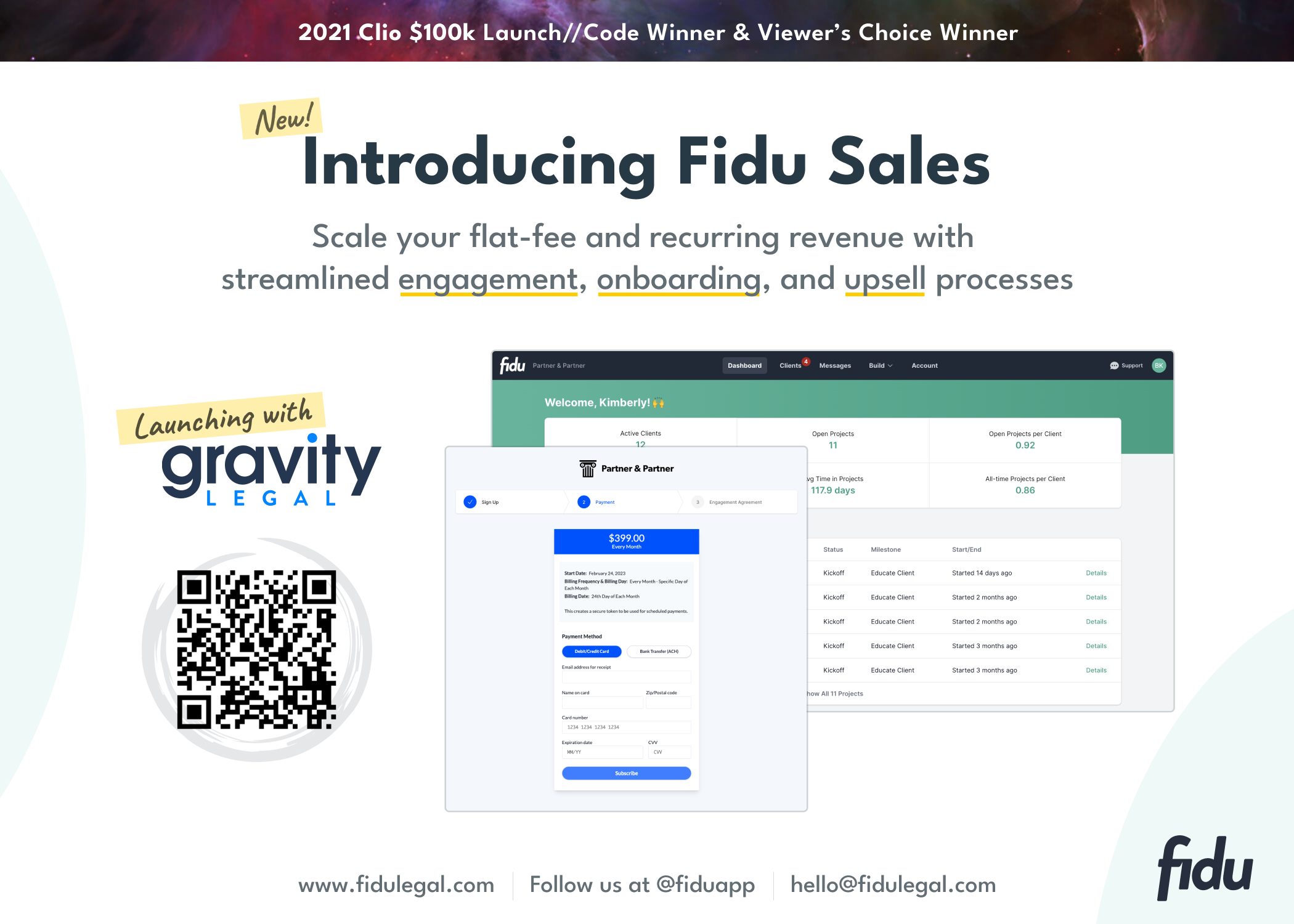 Led by legal subscription pioneer and Fidu Co-Founder, Kimberly Bennett, Fidu has revolutionized the way law firms deliver services by offering a platform that makes it easy to manage subscriptions, connect with clients, deliver content and track performance. The partnership with Gravity Legal will further enhance the platform by offering a secure and reliable online payment solution that integrates directly with Fidu and streamlines the client onboarding process; thus, improving the ongoing client experience.
