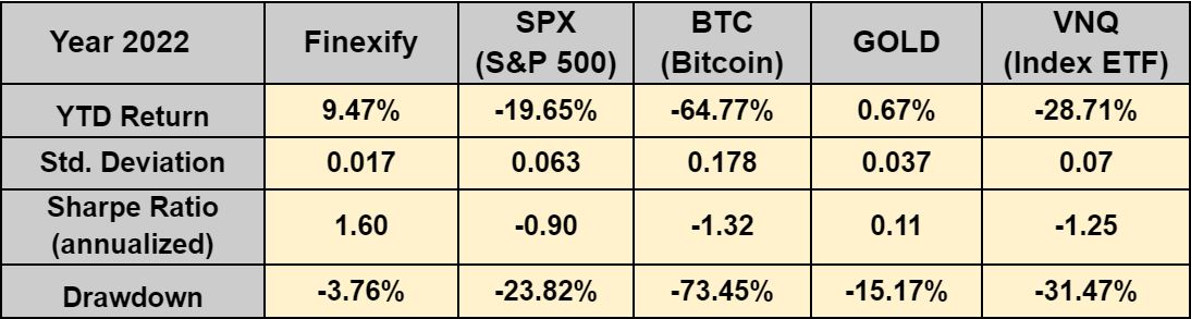 The Fund’s YTD 2022 results have outperformed the S&P 500, Bitcoin, GOLD, and VNQ (Vanguard global real estate index ETF), as shown in the table.