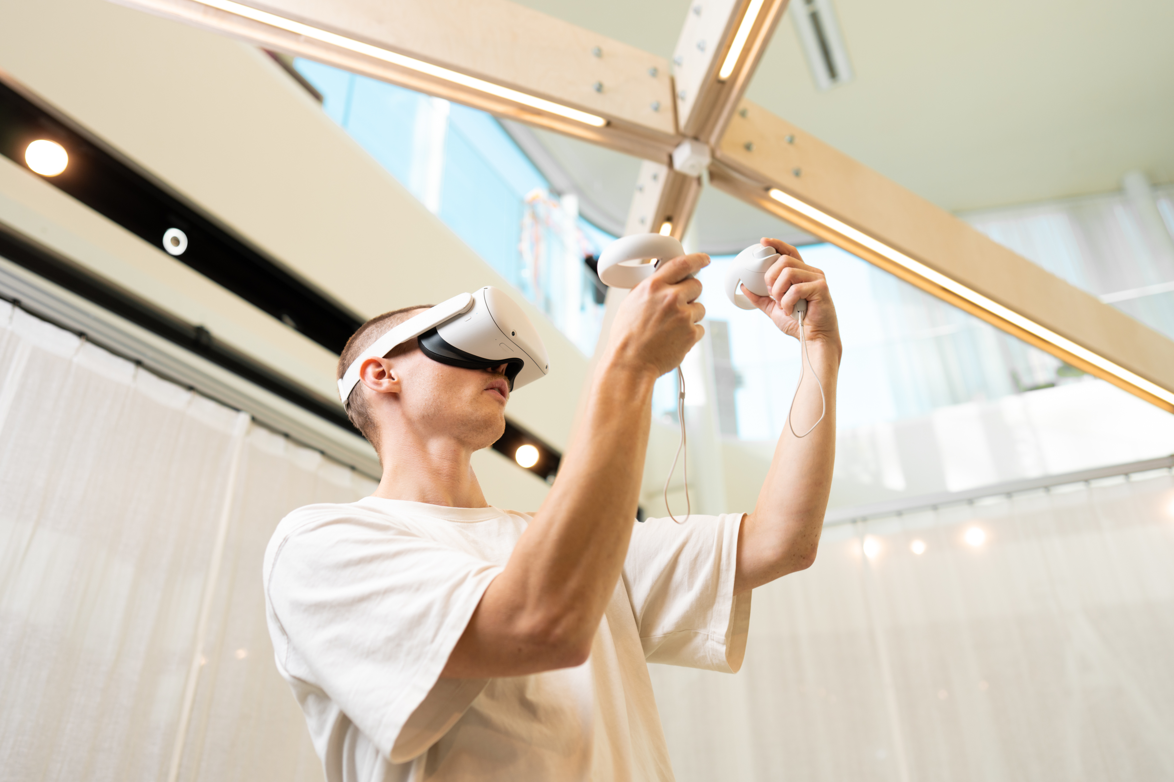 In a streak of user-centric design, the surrounding curtains gently guide people immersed in a virtual reality experience to stay within the physical parameters of their metaverse.