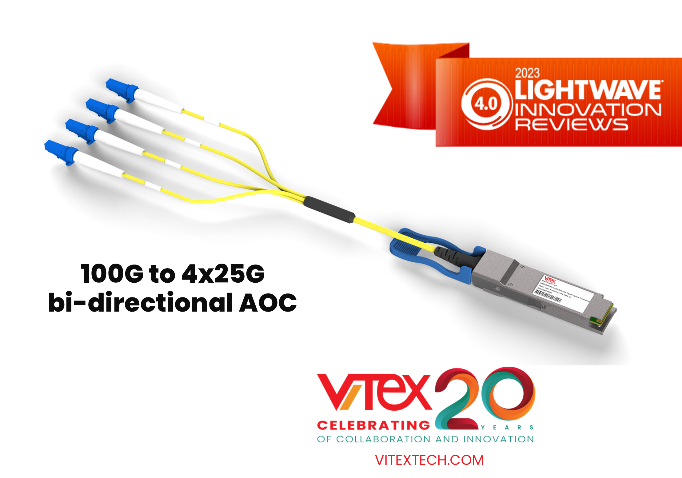 ENGLEWOOD CLIFFS, NJ, US, February 7, 2023 /EINPresswire.com/ — Vitex LLC, a customer-first supplier of superior quality, specialized fiber optic and connectivity products, announced today that its 100G to 4x25G bi-directional AOC was recognized among the best by the 2023 Lightwave Innovation Reviews.
