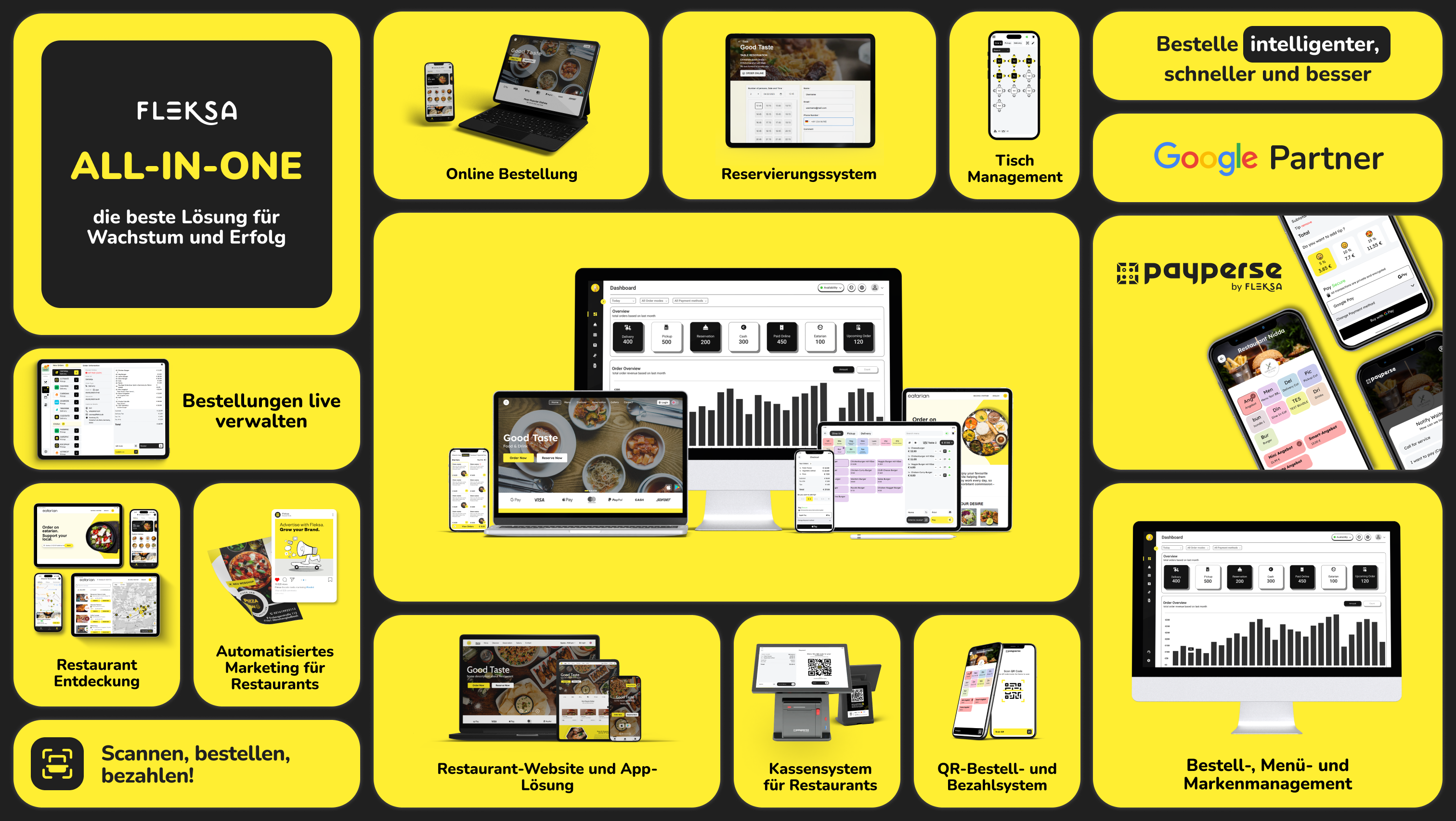 Die bahnbrechende Partnerschaft von Fleksa V3 mit Google bringt die Kraft einer der weltweit meistbesuchten Plattformen direkt vor die Tür des Speiselokals. Diese Zusammenarbeit ermöglicht es Kunden, Bestellungen aufzugeben und Reservierungen direkt über das Google My Business-Profil des Speiselokals zu tätigen, was die Kundenbindung und die Conversion-Raten erheblich steigert.