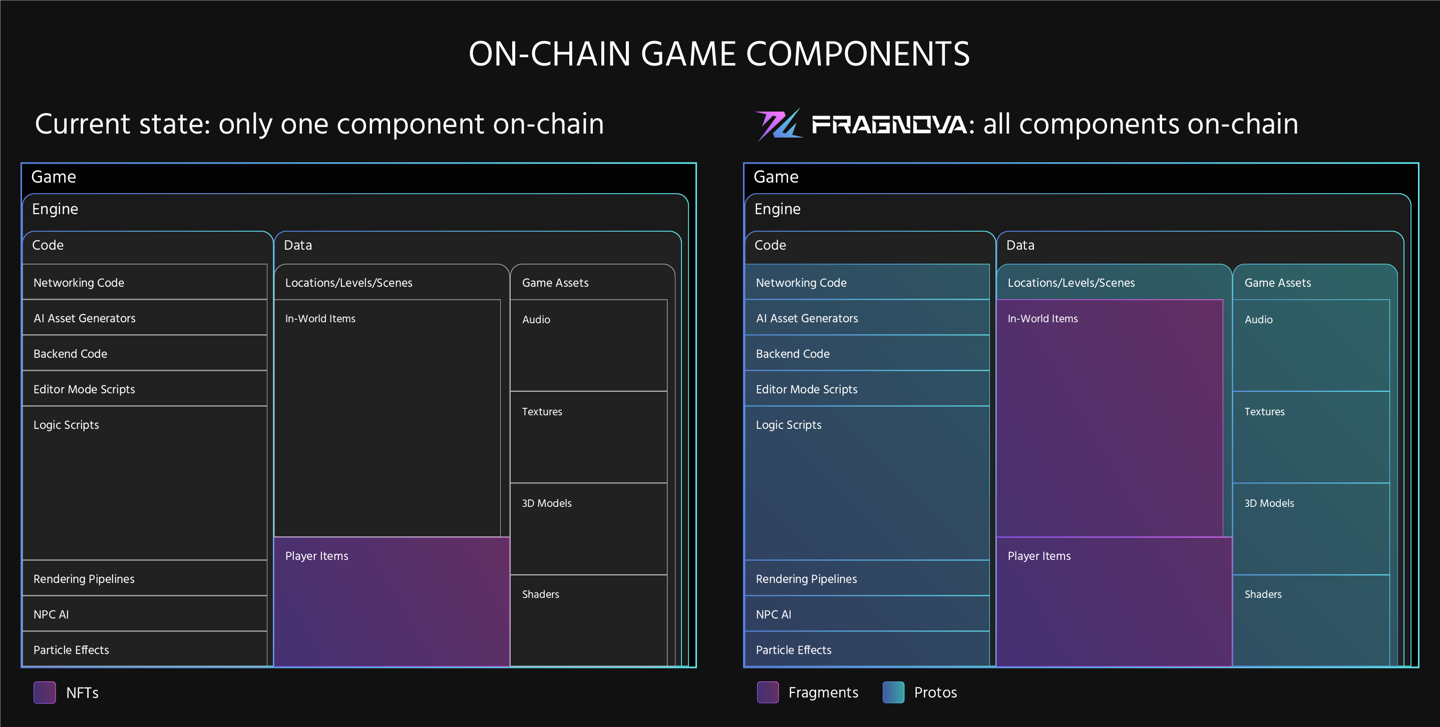 Fragnova stores these components on-chain as native assets, called Protos and Fragments, which are a flexible and improved version of NFTs. These assets have a sophisticated permission system and royalty distribution, ensuring players are rewarded for their contributions.