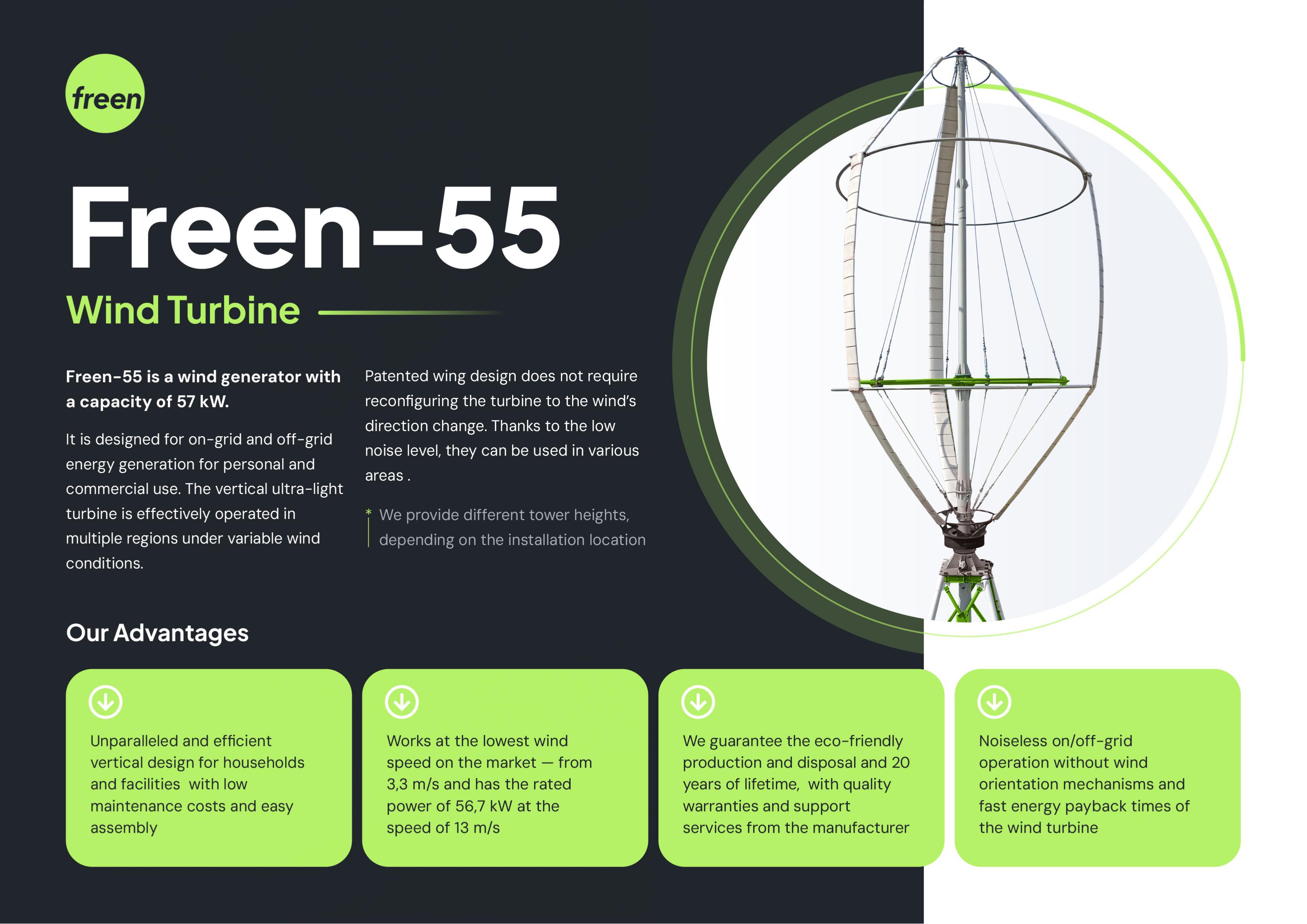 The eco-friendliness, efficiency, and quiet operation of FREEN-55, combined with low operational costs and easy assembly, open new horizons for the integration of wind energy systems into modern life.