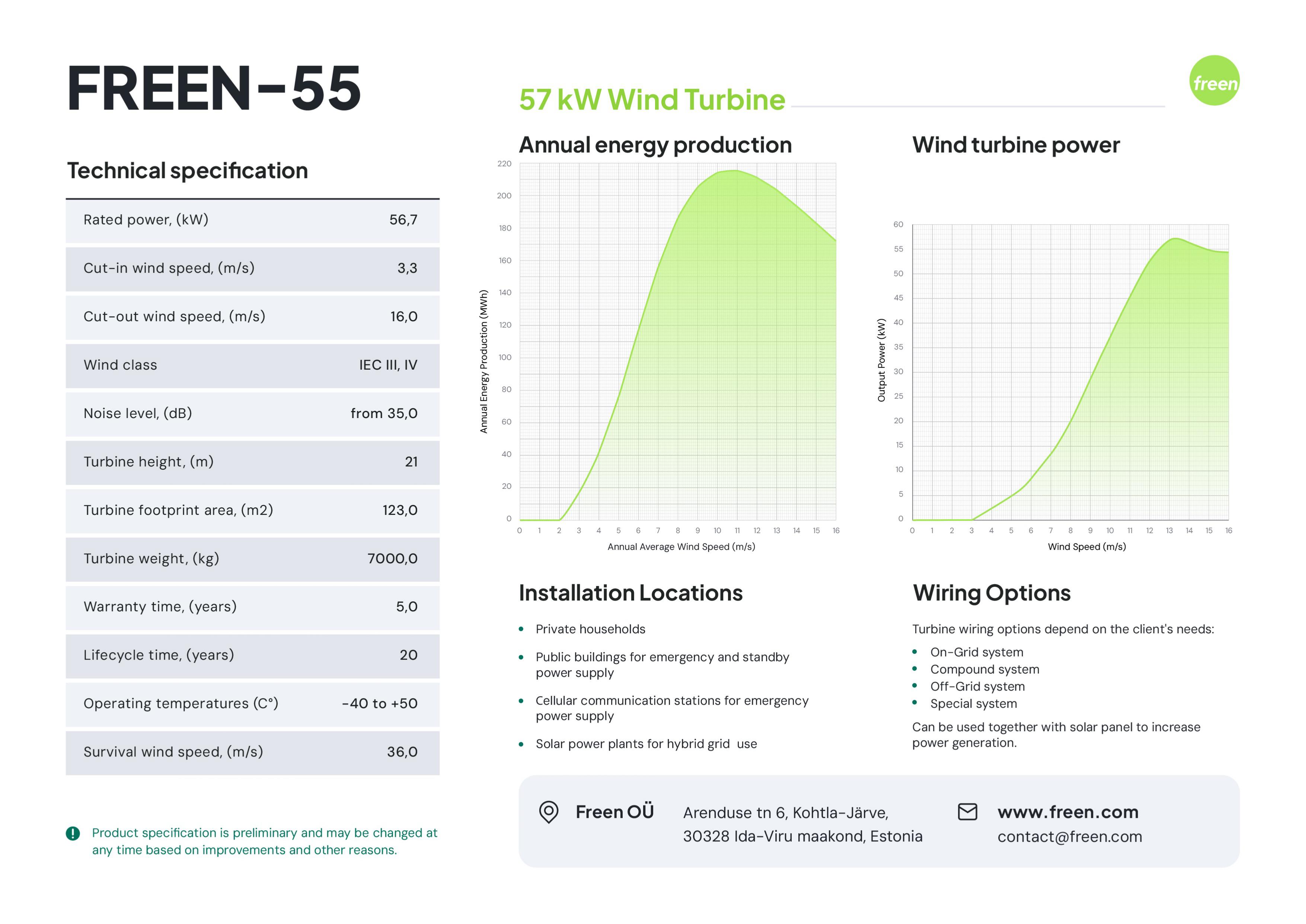 FREEN actively engages in the development and implementation of innovative wind energy solutions. Based in Estonia, FREEN is committed to providing the market with highly efficient, eco-friendly, and cost-effective wind turbines that meet the most modern standards of sustainable development.