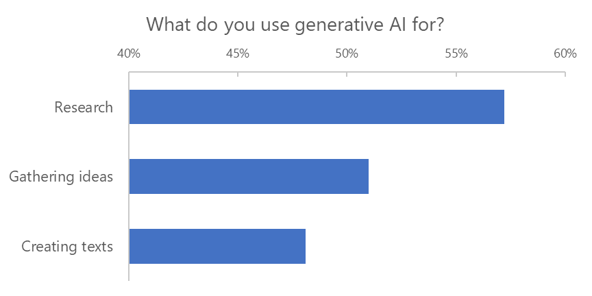 The most common current reason for use was “research” at 57%, followed by “gathering ideas” at 51% and “creating texts” at 48%. Use for “research” purposes was popular across many industries, from manufacturing to retail, finance, and healthcare. On the other hand, the adoption of the technology for “programming/coding assistance” was seen to be advancing in industries such as IT and machinery.