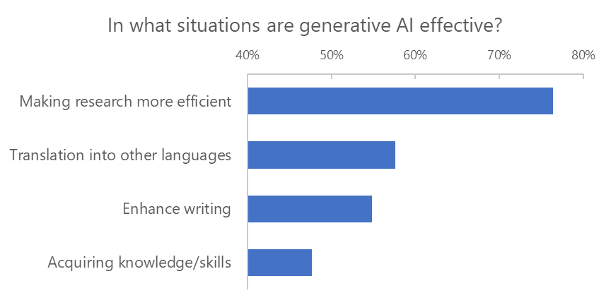 For the most effective task, “making research more efficient” (76%) was the top choice among the respondents. “Translation into other languages” and use to “enhance writing” followed.