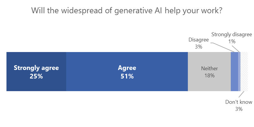 With the further penetration of generative AI, three-quarters of the total (25% “strongly agree” and 50% “agree”) think it will help their work.