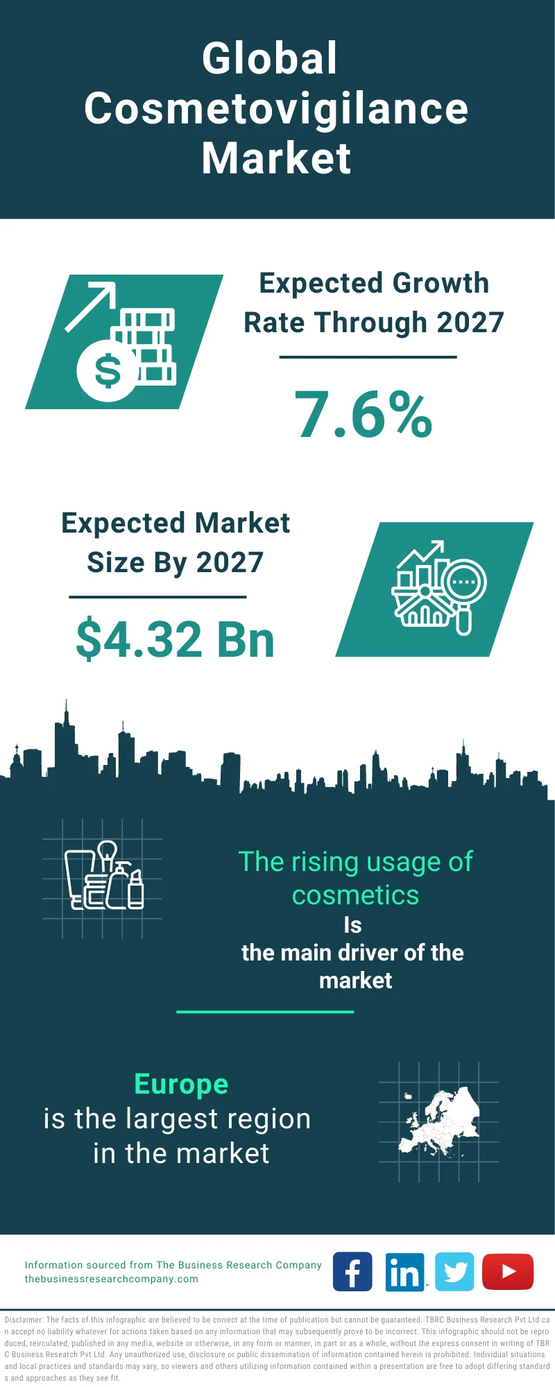 The “Cosmetovigilance Global Market Report 2023” by The Business Research Company offers a comprehensive analysis of the cosmetovigilance market. According to TBRC’s forecast, the cosmetovigilance market is expected to reach $4.32 billion by 2027, with a Compound Annual Growth Rate (CAGR) of 7.6%.