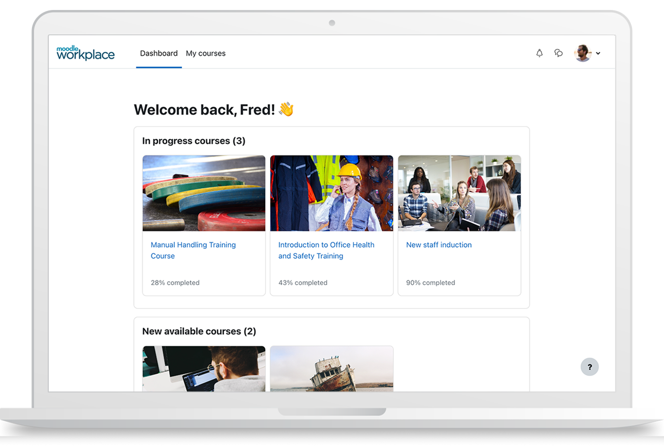 The Dashboard in Moodle Workplace 4.0 is simplified to display learners’ current enrolments plus a section for new available courses. Learners can see completion status at a glance, and when a learner completes a course, further courses unlocked as part of a learning path or program will appear in the “New available courses” section.