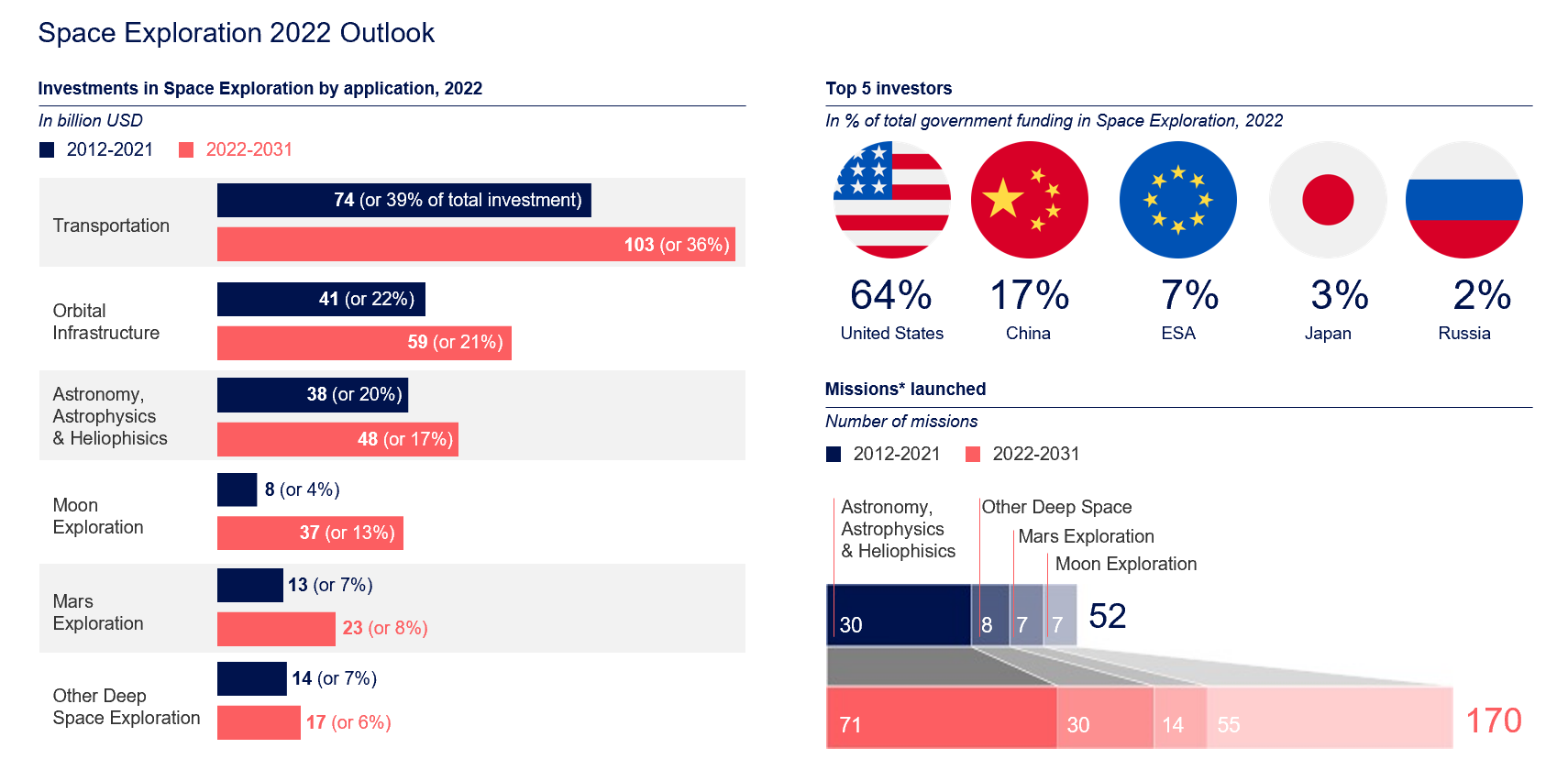 Euroconsult’s latest ‘Prospects for Space Exploration’ report found that more countries than ever are joining the space exploration market. Newcomers or recent players include Australia and the U.A.E., with overall government investments towards space exploration in 2022 at 59% higher than 10 years ago.
