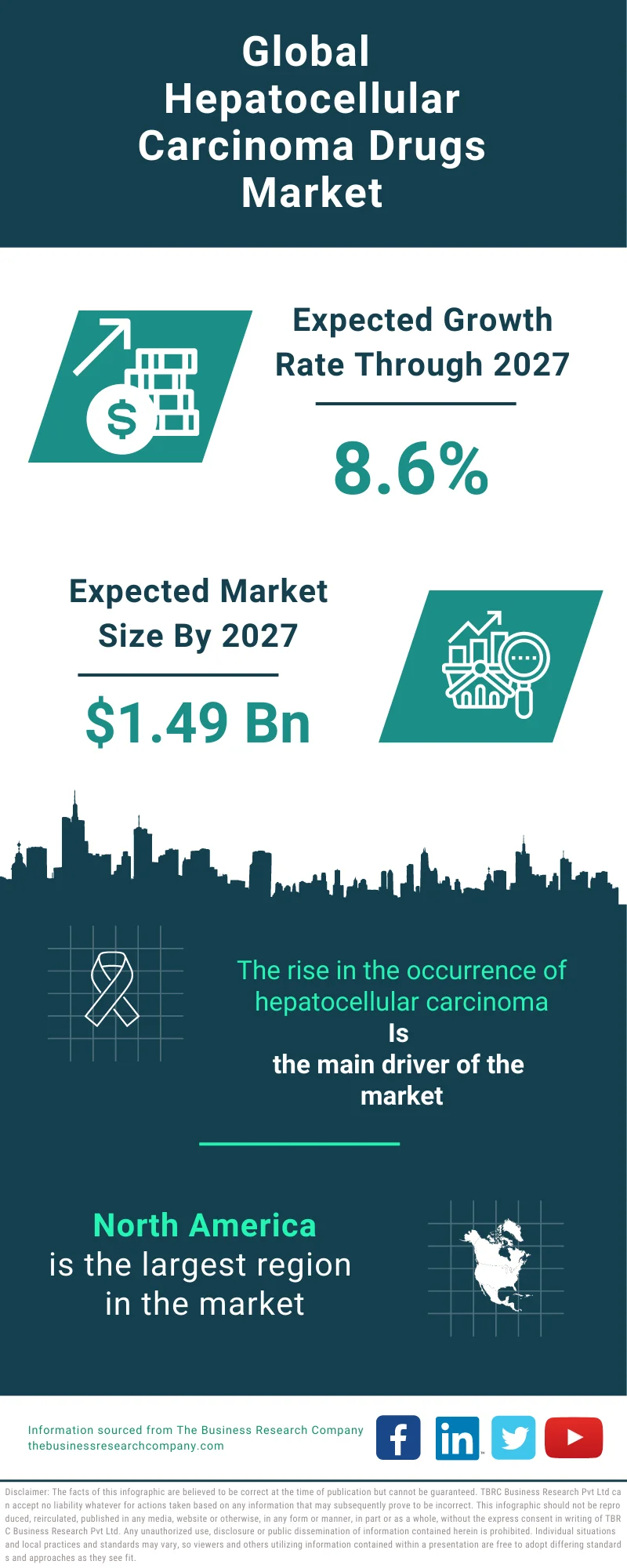 The “Hepatocellular Carcinoma Drugs Global Market Report 2023” by The Business Research Company provides in-depth market insights. According to TBRC’s forecast, the hepatocellular carcinoma drugs market is expected to reach $1.49 billion in 2027 with a CAGR of 8.6%.