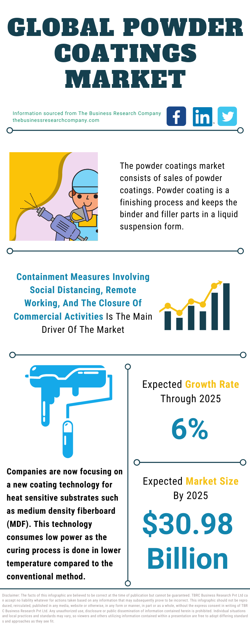 LONDON, GREATER LONDON, UK, October 11, 2021 /EINPresswire.com/ — According to the new market research report ‘Powder Coatings Global Market Report 2021: COVID-19 Impact And Recovery’ published by The Business Research Company, the powder coatings market is expected to grow from $22.11 billion in 2020 to $24.39 billion in 2021 at a compound annual growth rate (CAGR) of 10.3%.The growth is mainly due to the companies rearranging their operations and recovering from the COVID-19 impact, which had earlier led to restrictive containment measures involving social distancing, remote working, and the closure of commercial activities that resulted in operational challenges. The market is expected to reach $30.98 billion in 2025 at a CAGR of 6%. The limitations on products that generate high VOCs promote the sales of powder coatings thereby driving the market.