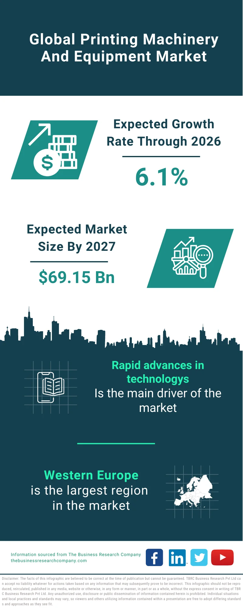 The growth in the printing machinery and equipment market is due to rapid advances in technology. Western Europe region is expected to hold the largest printing machinery and equipment market share. Major players in the printing machinery and equipment market include Canon Inc., Konica Minolta, Inc., Fujifilm Corporation, Heidelberger Druckmaschinen AG.