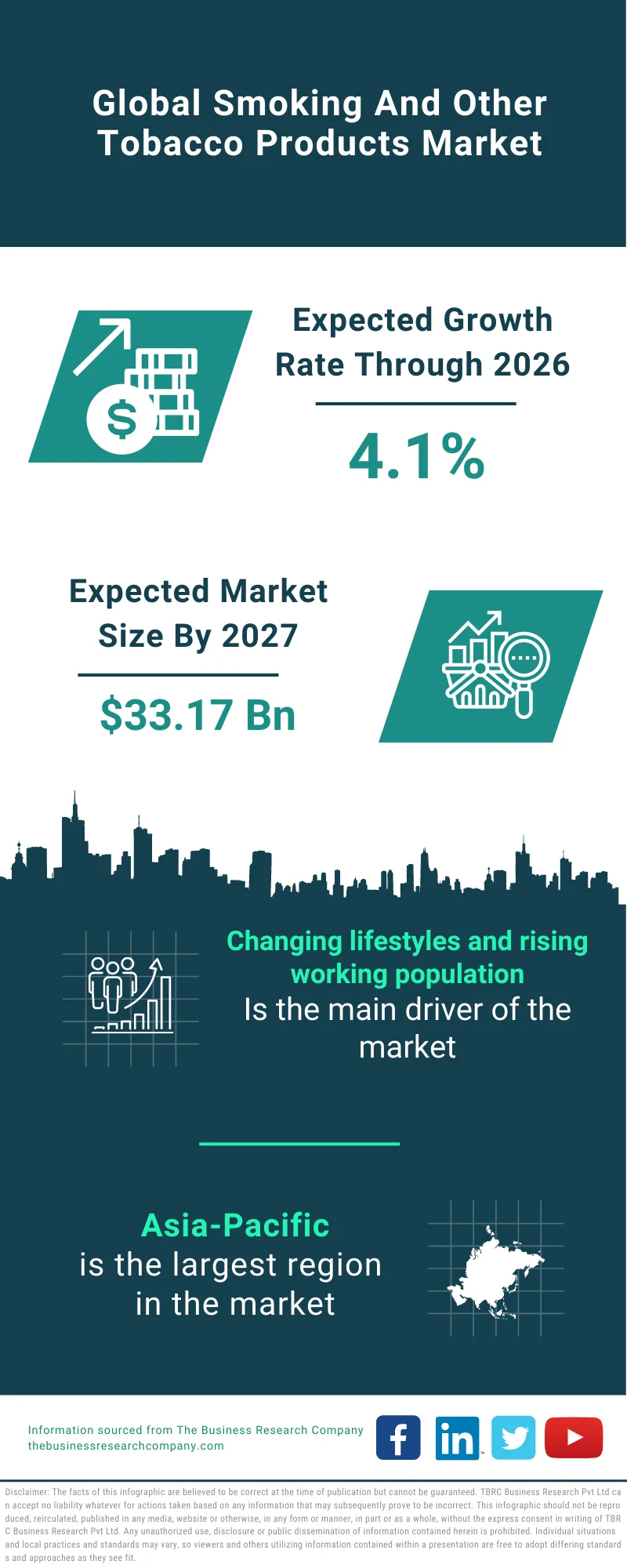 The Business Research Company’s “Smoking And Other Tobacco Products Global Market Report 2023” is a comprehensive source of information that covers every facet of the market. As per TBRC’s market forecast, the smoking and other tobacco products market size is predicted to reach $33.17 billion in 2027 at a CAGR of 4.1%.
